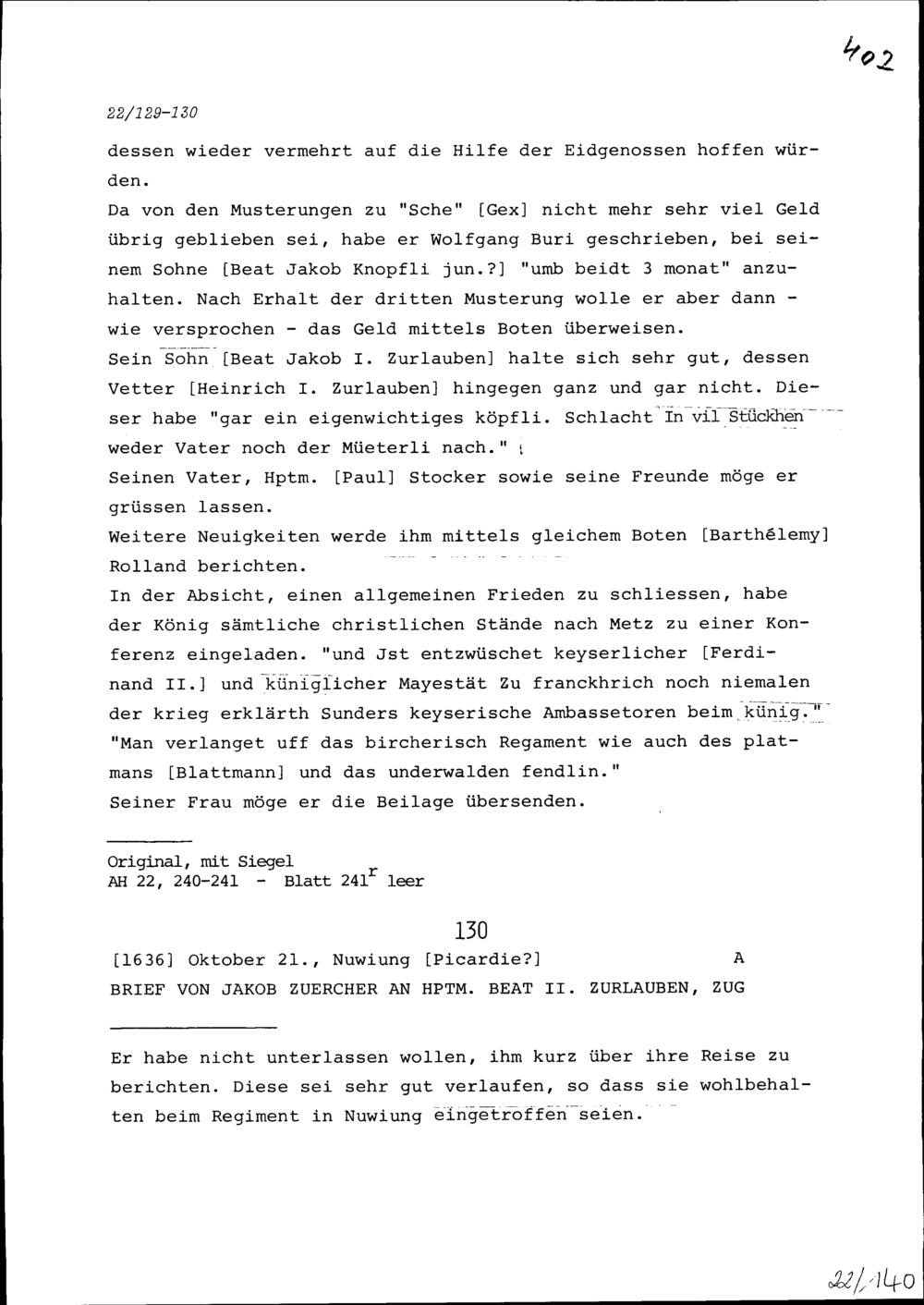 Schreiben von Beat Jakob Knopfli, Hauptmann, an Beat II. Zurlauben, Hauptmann, Z...