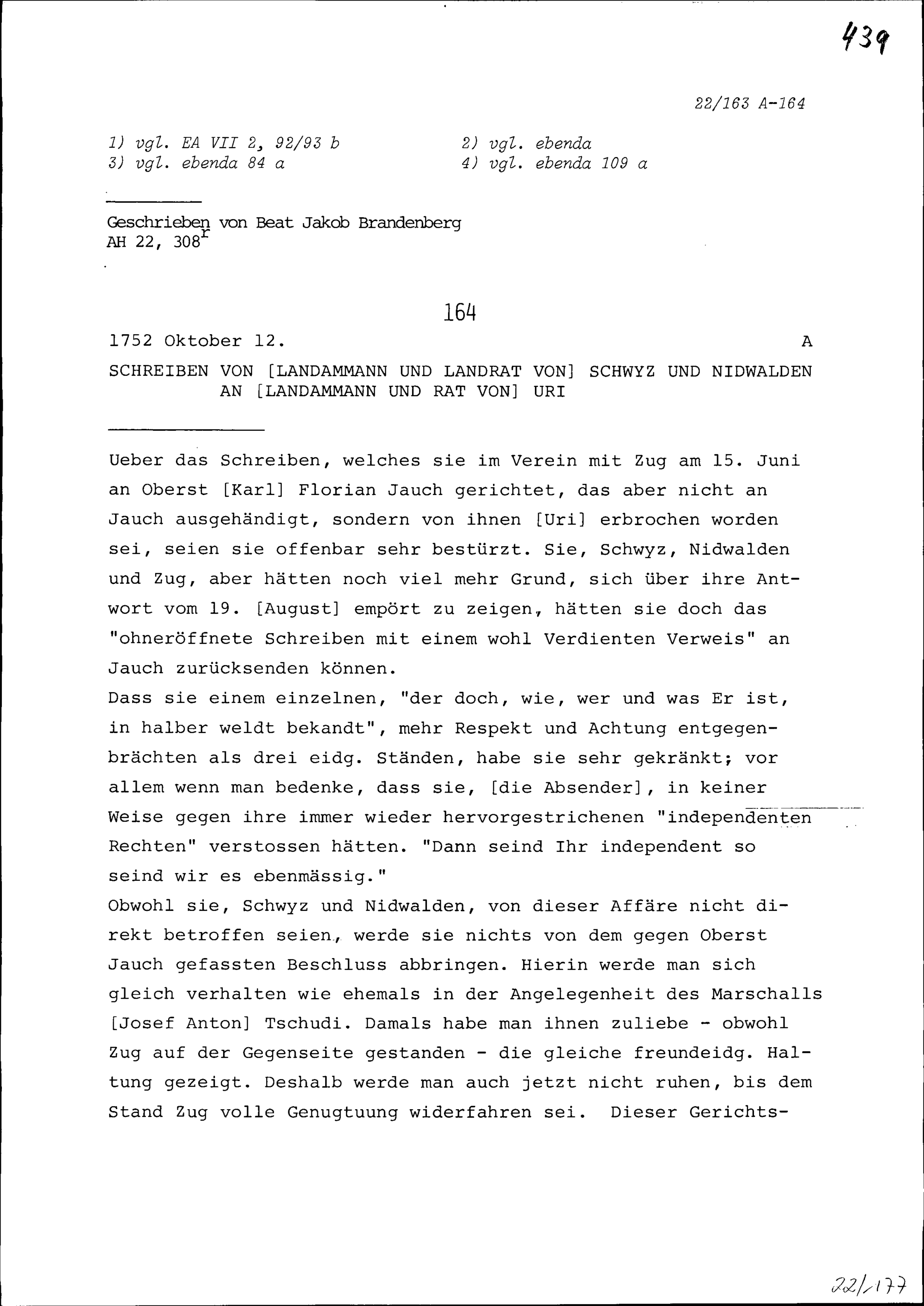 Entgegnungen von Beat Jakob Brandenberg, Hauptmann, zur Missive Uris an Karl IV., König beider Sizilien