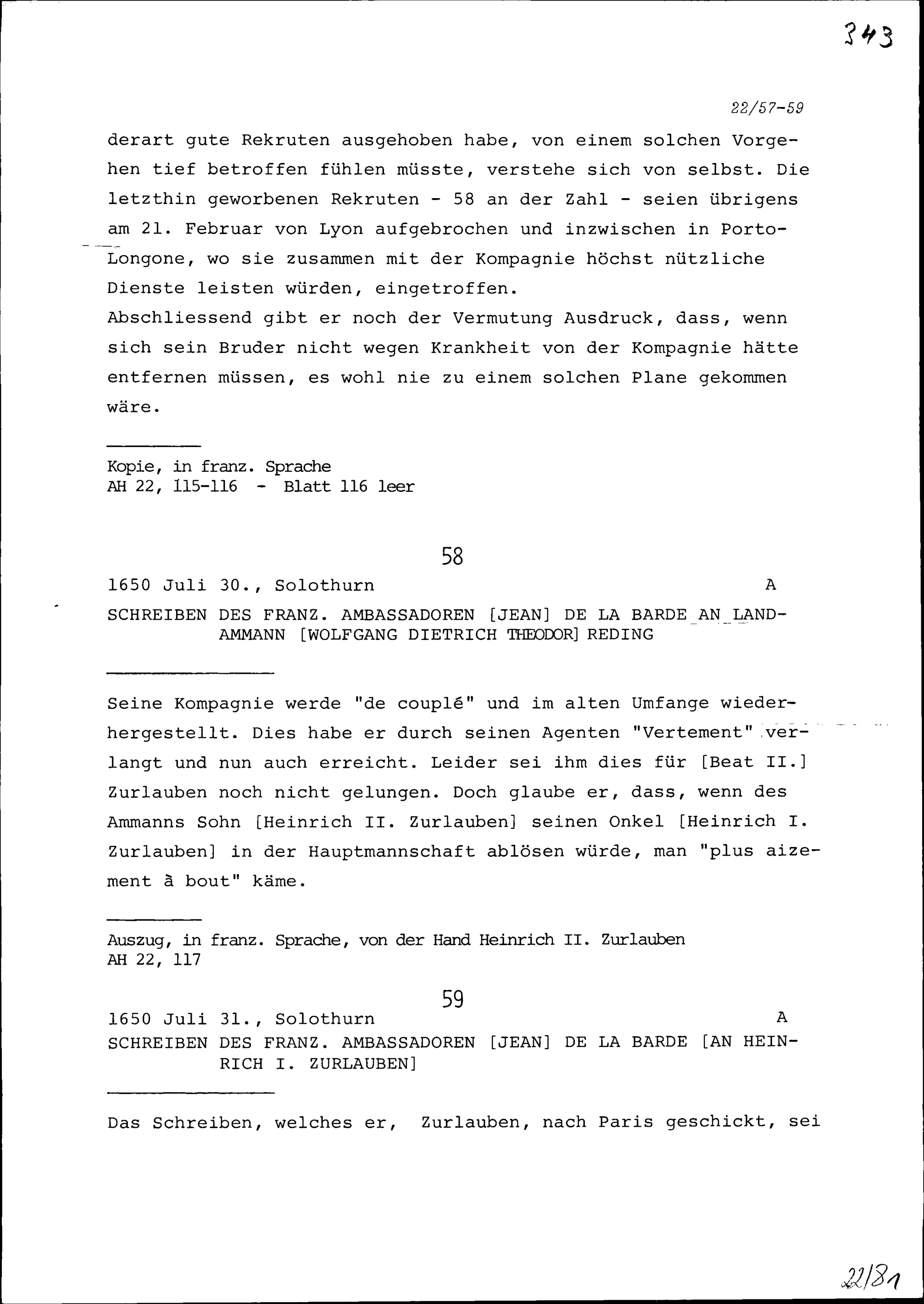 Schreiben von Jean de la Barde, Ambassador von Frankreich, an Heinrich I. Zurlauben
