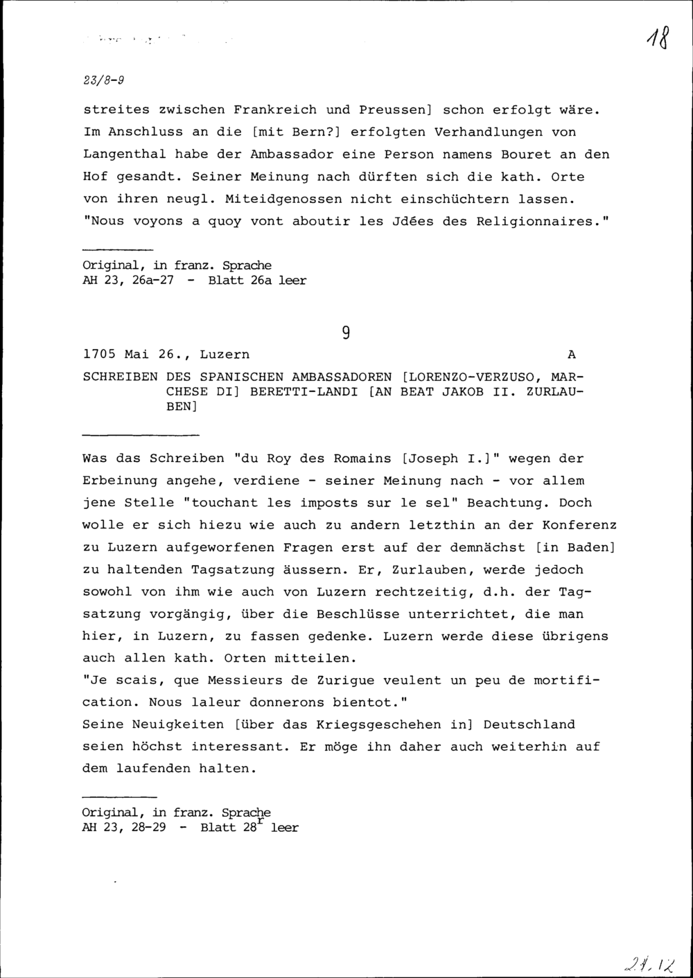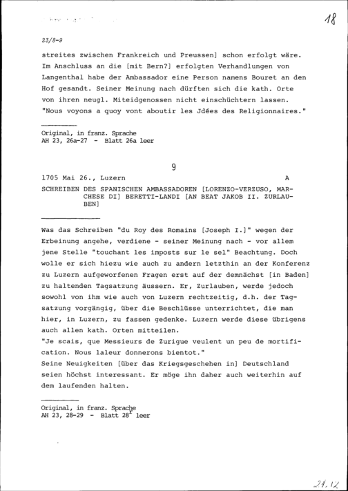 Schreiben von Lorenzo Verzuso, Marchese di Beretti, Ambassador von Spanien, an Beat Jakob II. Zurlauben