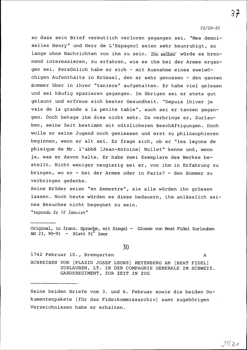 Schreiben von François de Muyssart de Steenbourg an Beat Fidel Zurlauben, Gardehauptmann, Paris