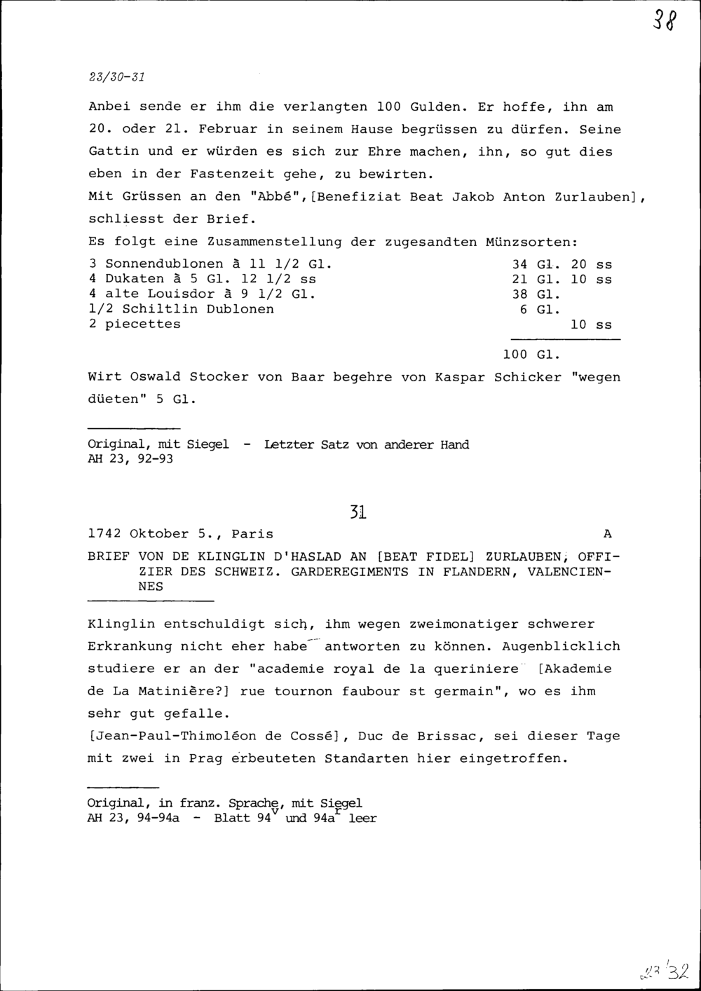 Schreiben von Plazid Josef Leonz Meyenberg an Beat Fidel Zurlauben, Leutnant in der Generalkompanie im Schweizer Garderegiment, zur Zeit in Zug