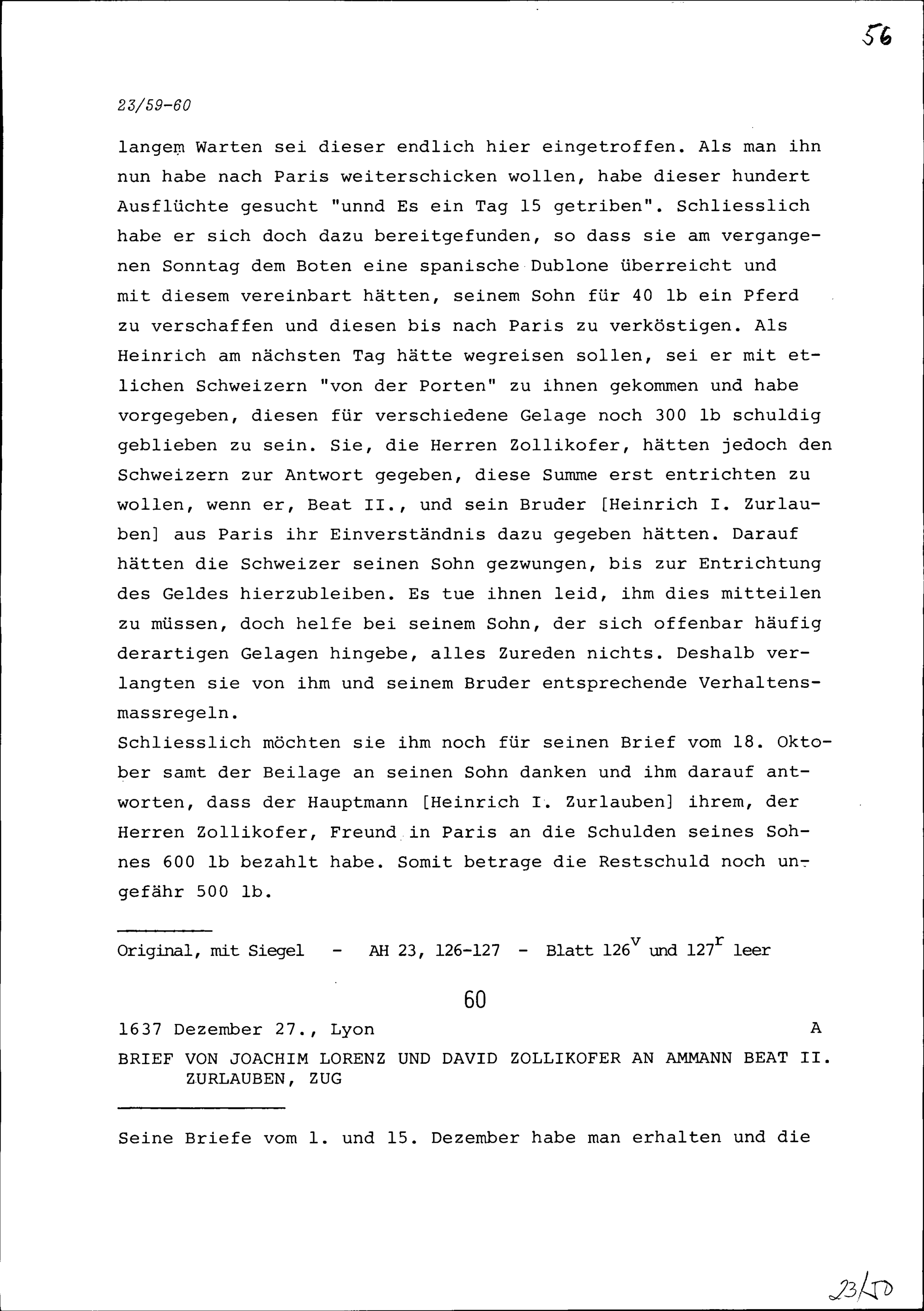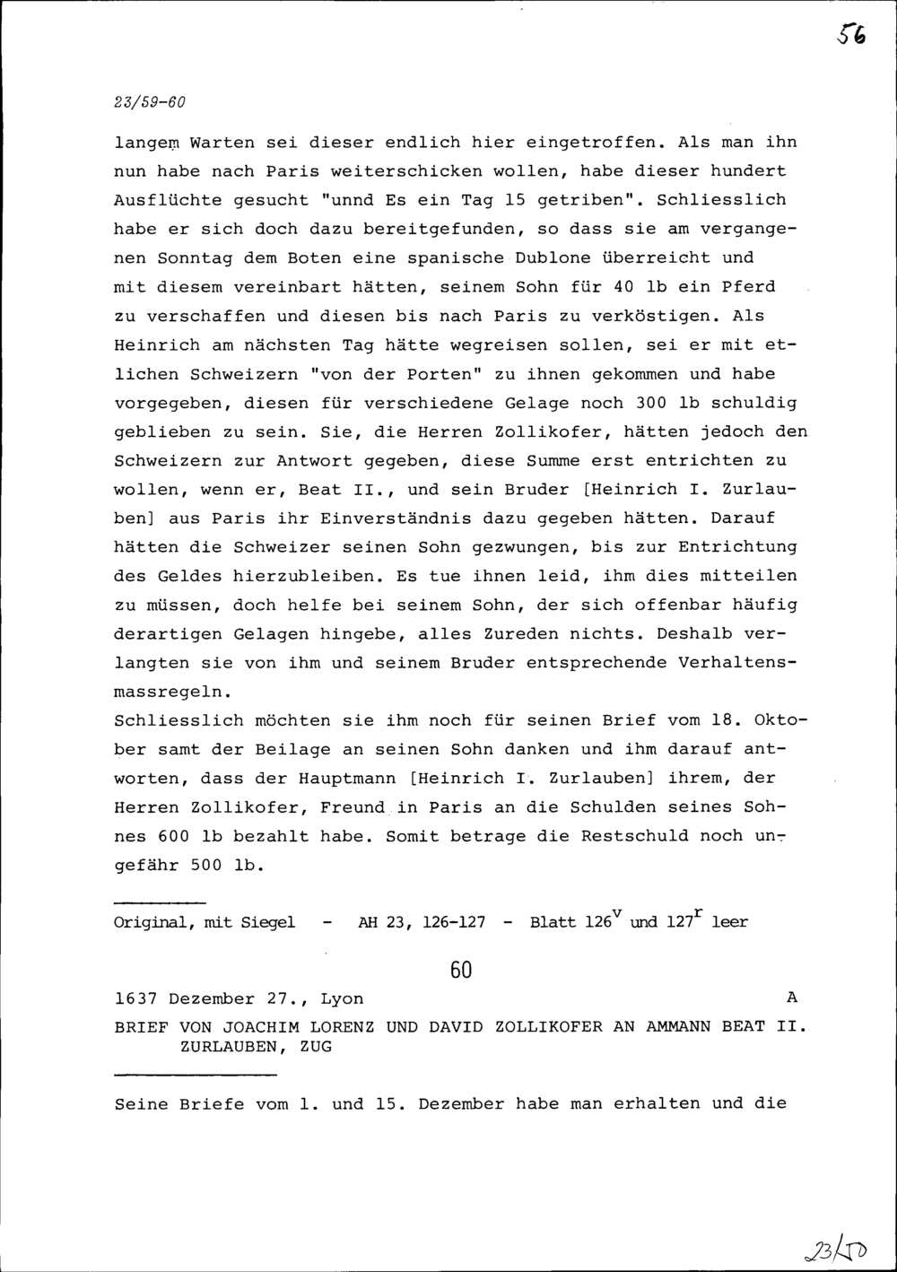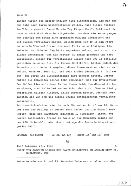 Schreiben von Joachim Lorenz und David Zollikofer an Beat II. Zurlauben, Ammann, Zug