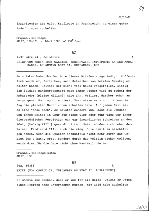 Schreiben von Joachim Lorenz und David Zollikofer an Beat II. Zurlauben, Ammann, Zug