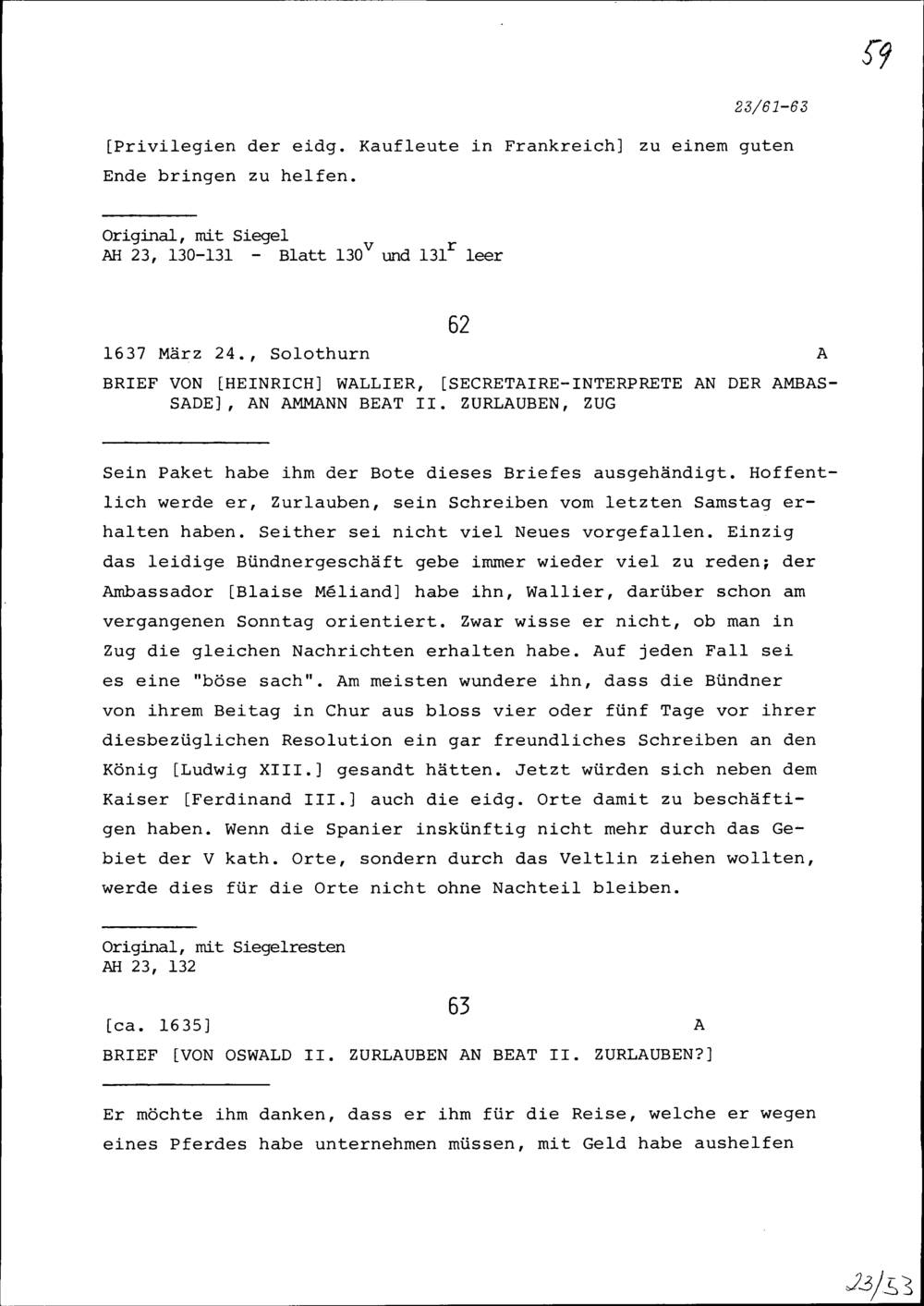 Schreiben von Oswald II. Zurlauben an Beat II. Zurlauben