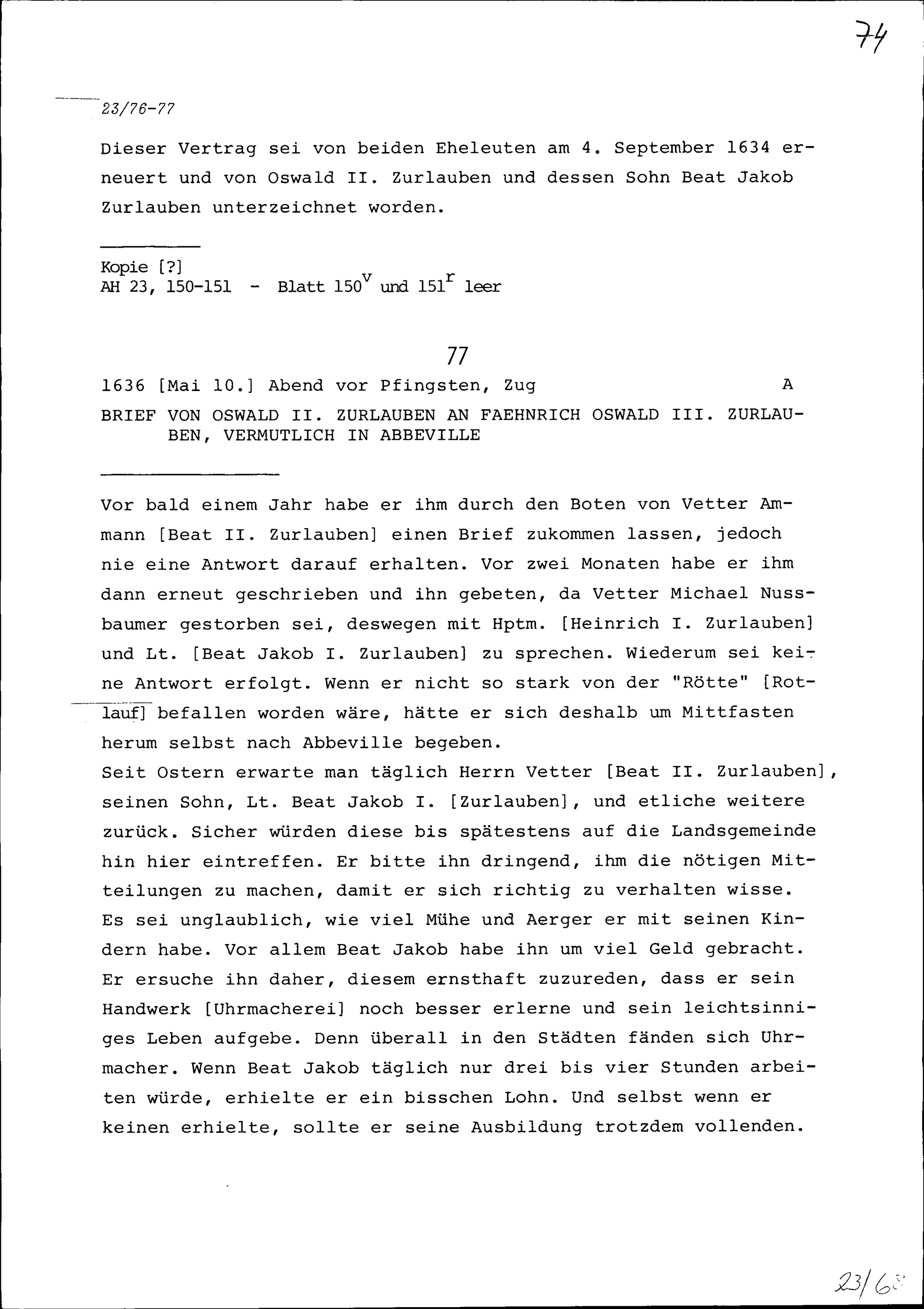 Ehevertragserneuerung zwischen Oswald II. Zurlauben, Landvogt,und Margareta von Rickenbach