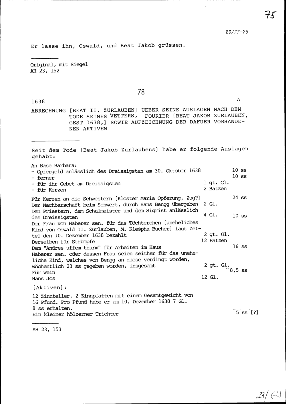 Schreiben von Oswald II. Zurlauben an Oswald III. Zurlauben, Fähnrich, vermutlich...