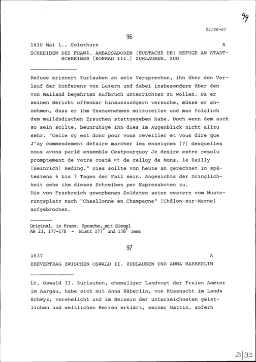 Ehevertrag zwischen Oswald II. Zurlauben und Anna Häberlin