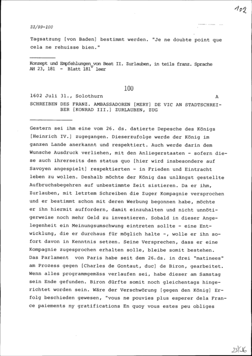 Schreiben von Jean de la Barde, Ambassador von Frankreich, an Ammann und Rat von Stadt und Amt Zug