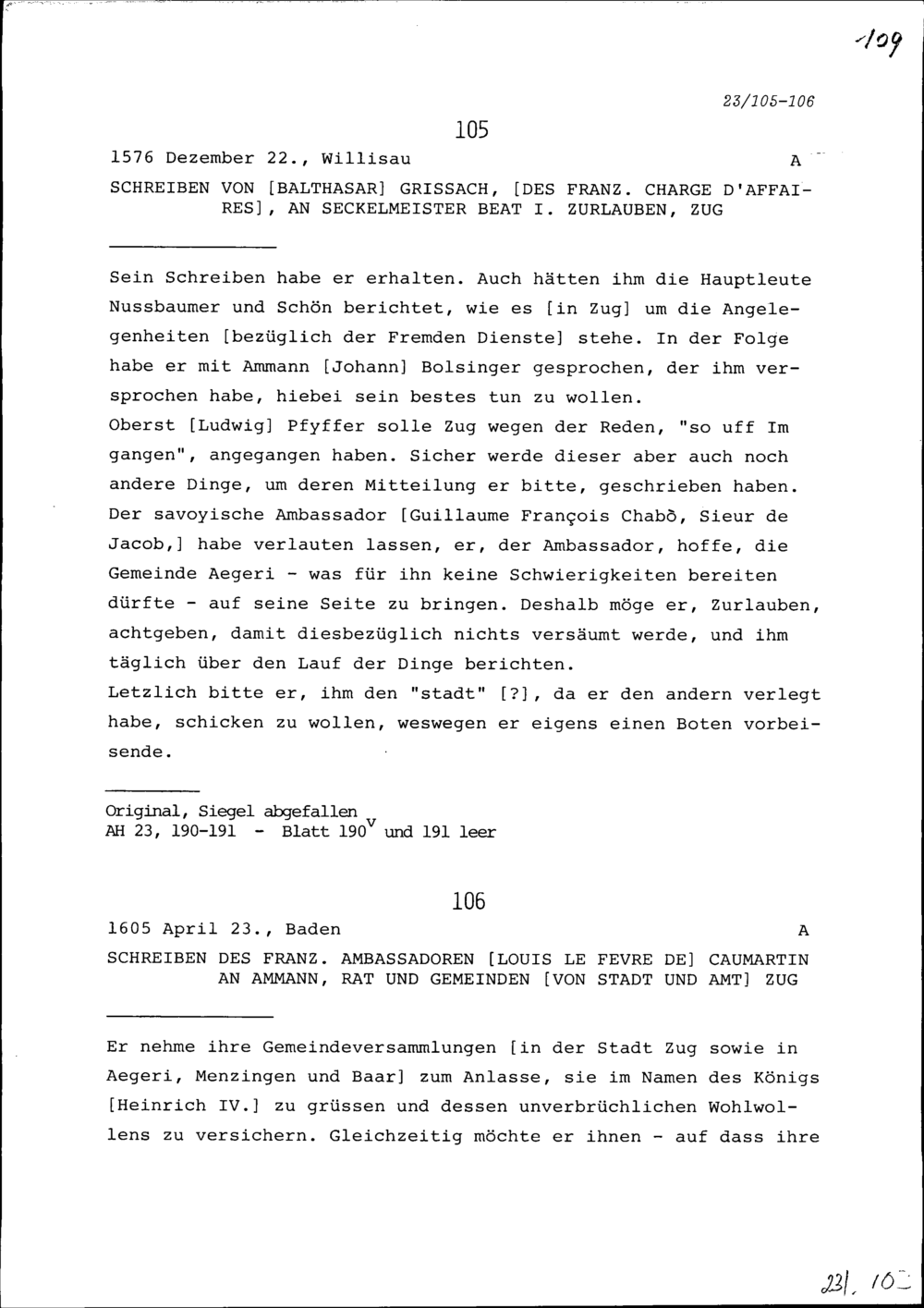 Schreiben von Louis Le Fèvre de Caumartin, Ambassador von Frankreich, an Ammann, Rat und Gemeinden von Stadt und Amt Zug