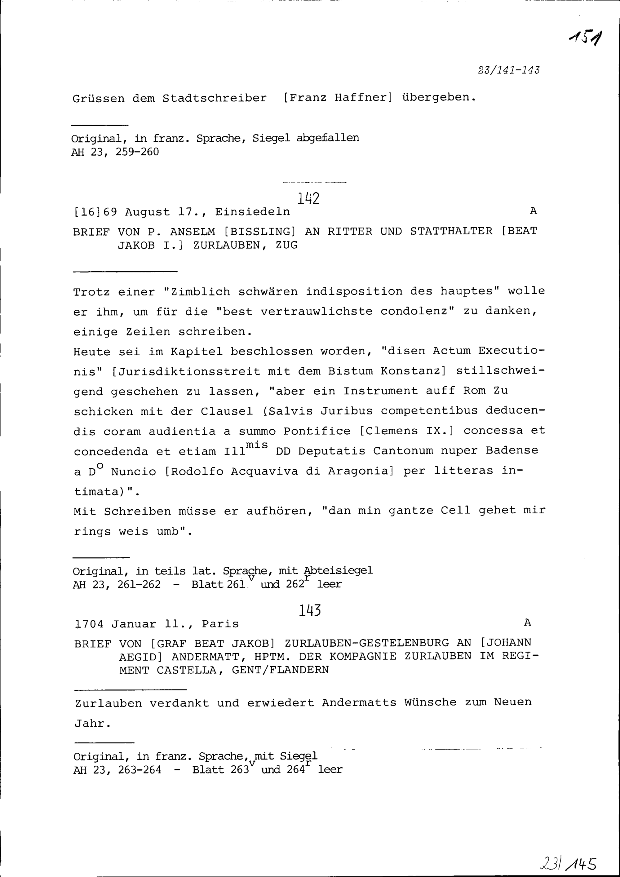 Schreiben von Heinrich II. Zurlauben an Hans Wilhelm von Steinbrugg, Schultheiss, Solothurn