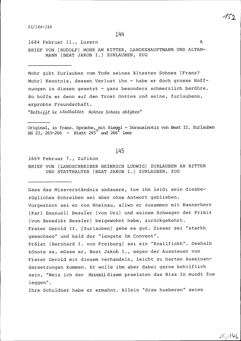 Schreiben von Heinrich Ludwig Zurlauben, Landschreiber, an Beat Jakob I. Zurlauben, Statthalter, Zug