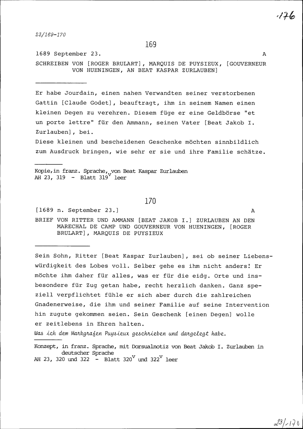 Schreiben von Beat Jakob I. Zurlauben, Ammann, an Roger Brûlart, Marquis de Puysieux, Feldmarschall und Gouverneur von Hüningen