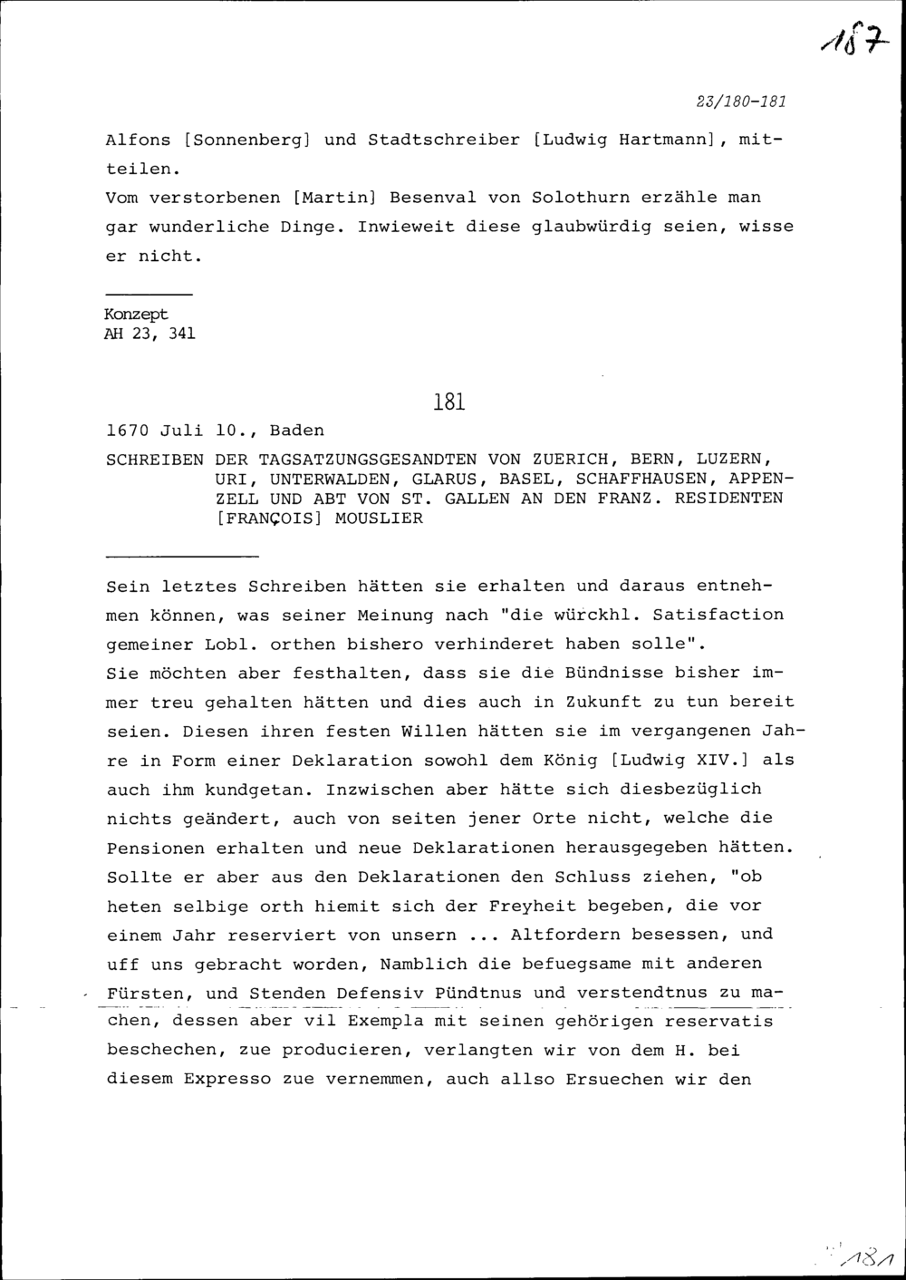 Schreiben von Beat II. Zurlauben an Kaspar Pfyffer, Landvogt