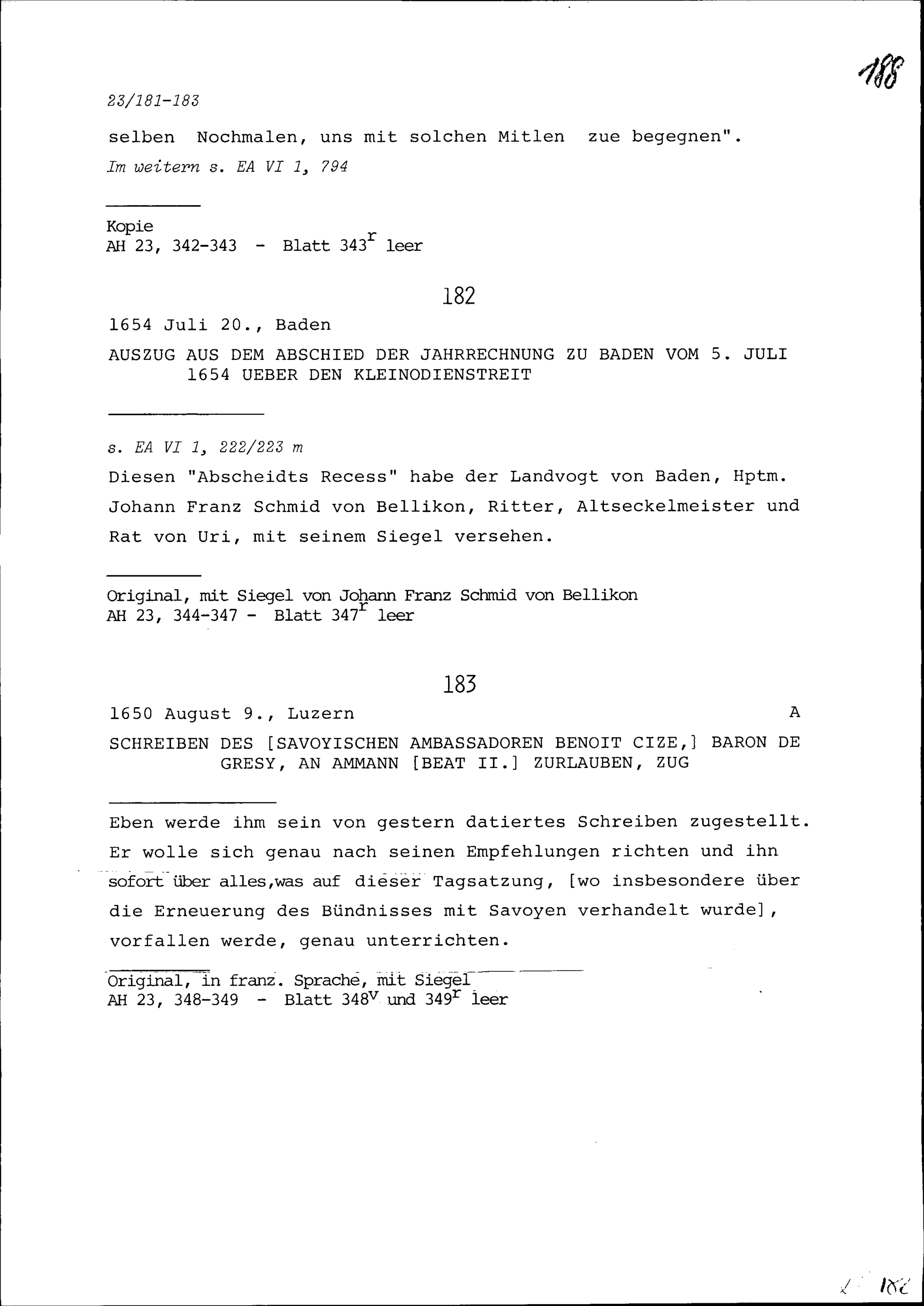 Schreiben von Benoît II. Cize, Baron de Grésy, Ambassador von Savoyen, an Beat II. Zurlauben, Ammann, Zug