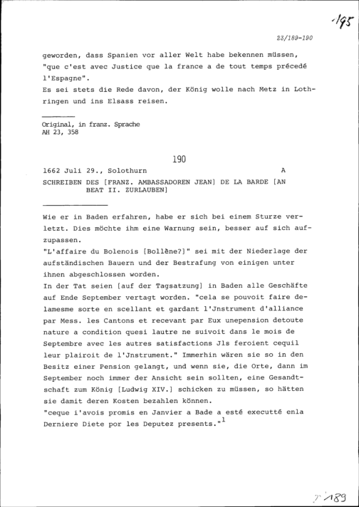 Schreiben von Jean de la Barde, Ambassador von Frankreich, an Beat II. Zurlauben