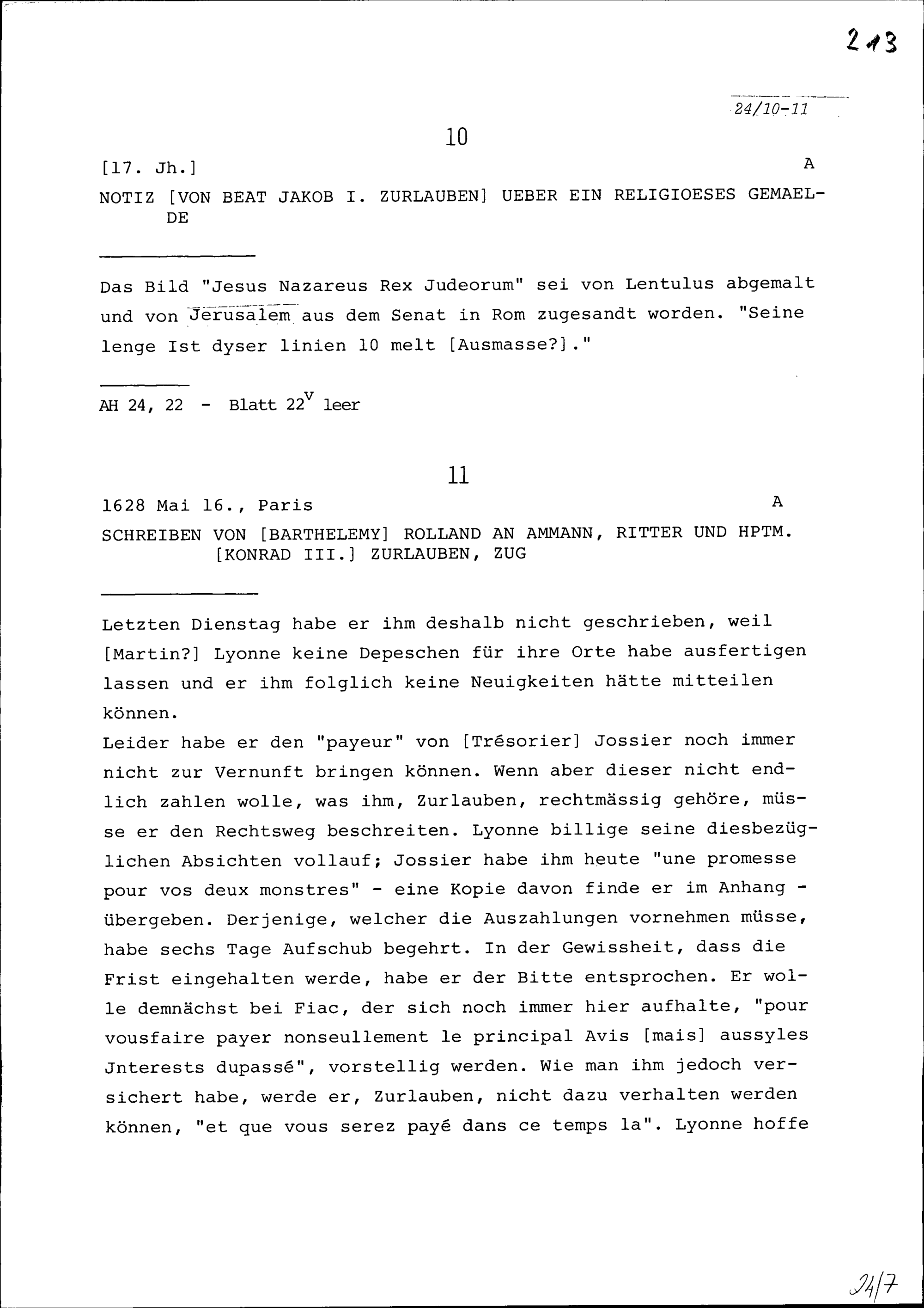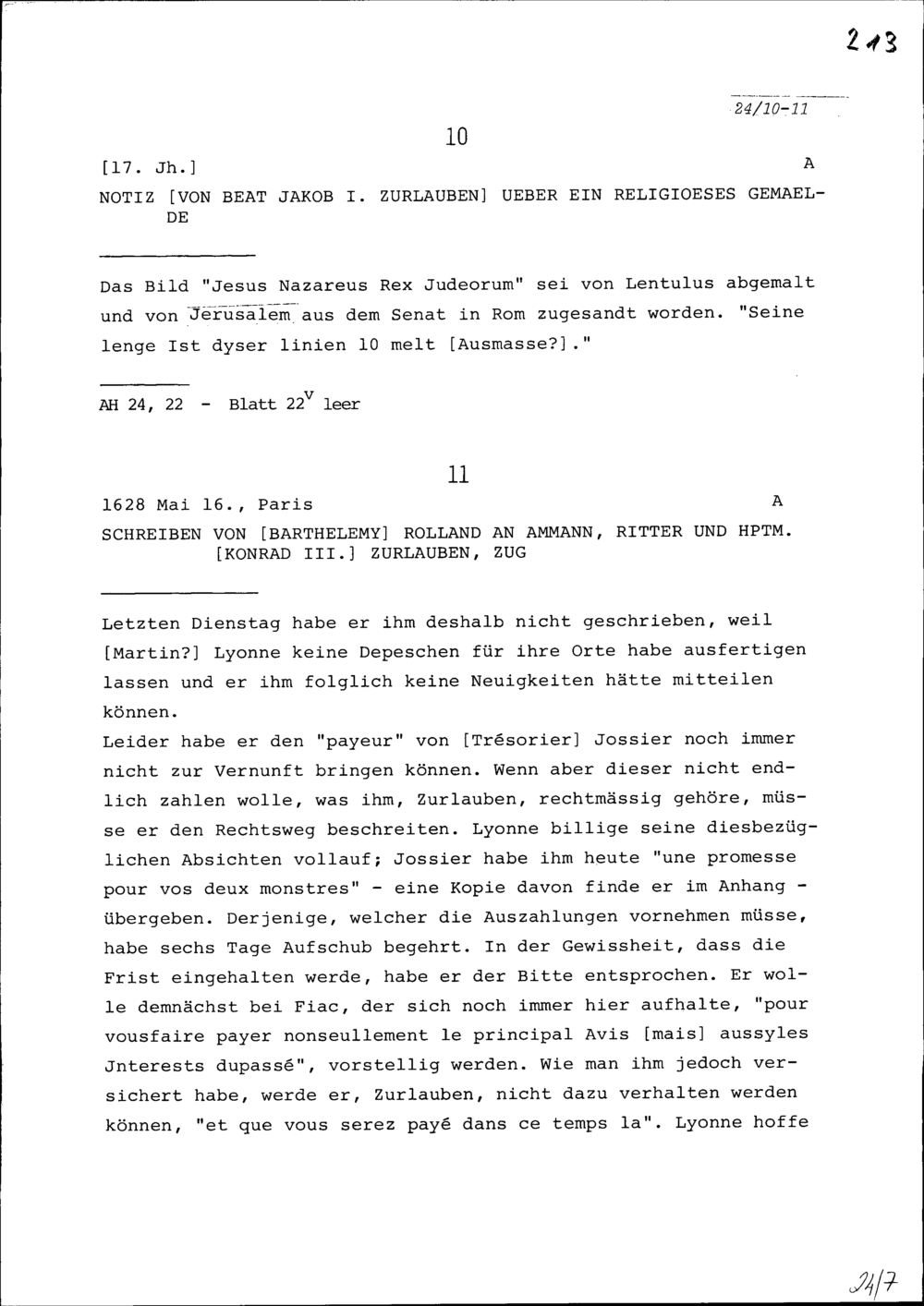 Schreiben von Barthélémy Rolland an Konrad III. Zurlauben, Ammann und Hauptmann, Zug