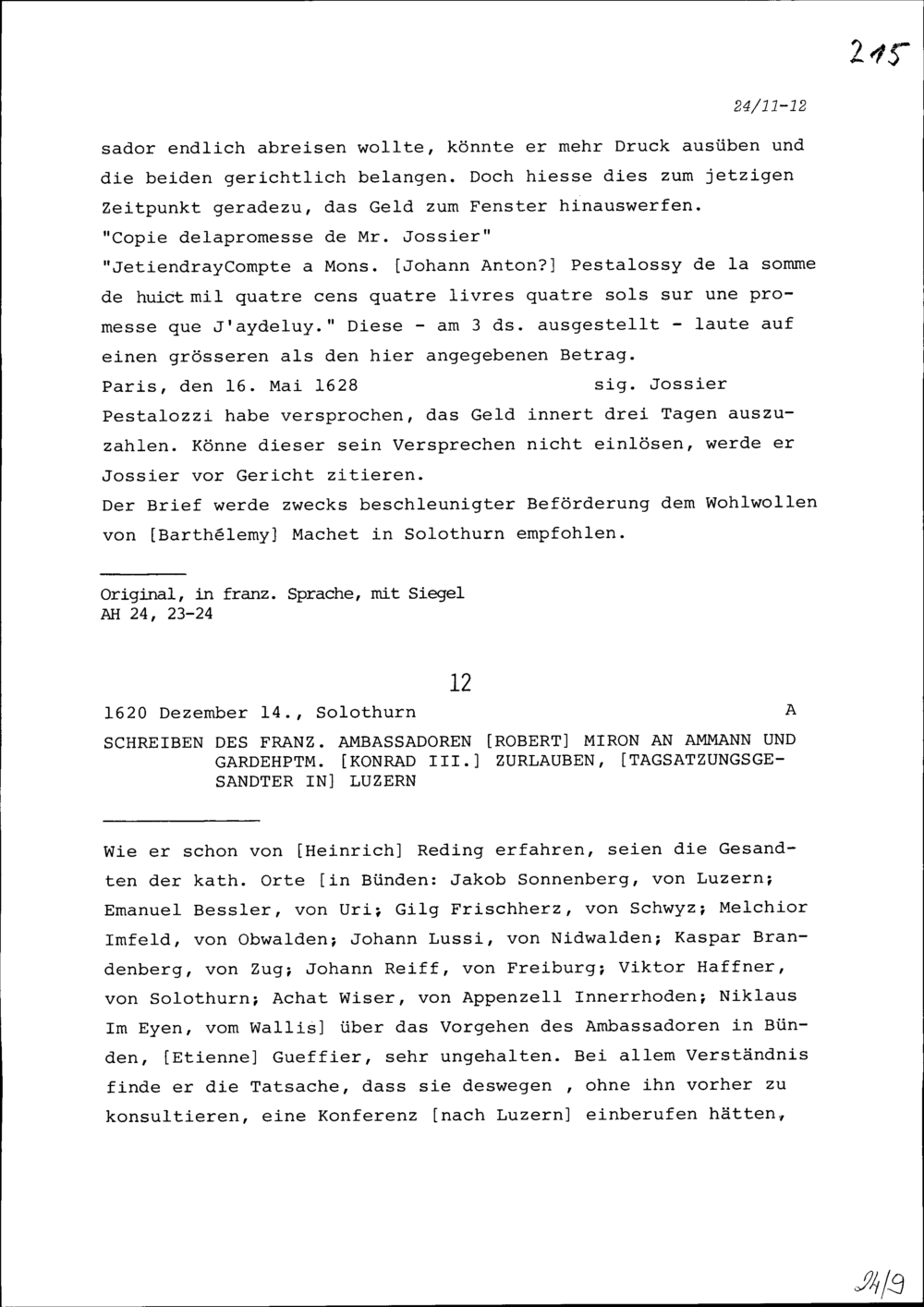 Schreiben von Barthélémy Rolland an Konrad III. Zurlauben, Ammann und Hauptmann, Zug