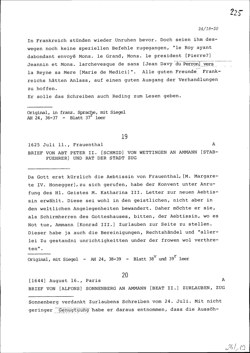 Schreiben von Alfons von Sonnenberg an Beat II. Zurlauben, Ammann, Zug