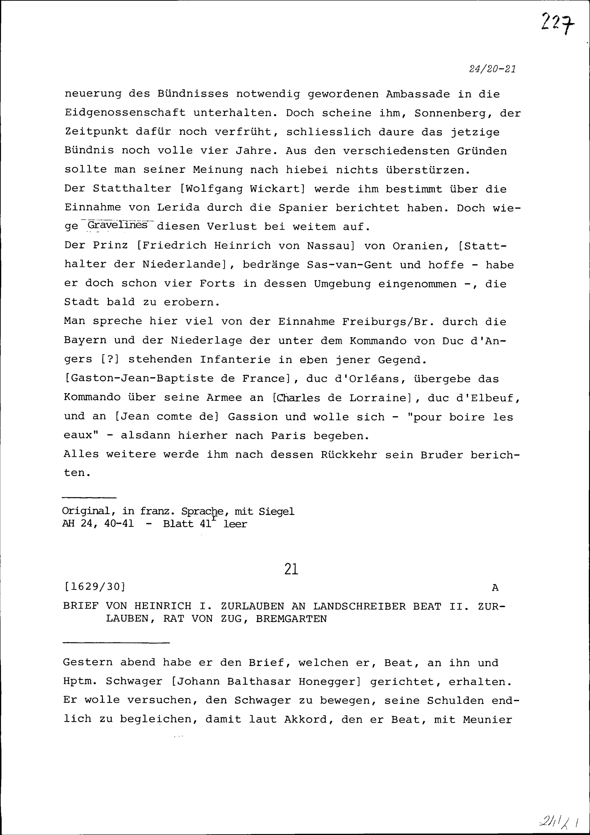 Schreiben von Alfons von Sonnenberg an Beat II. Zurlauben, Ammann, Zug