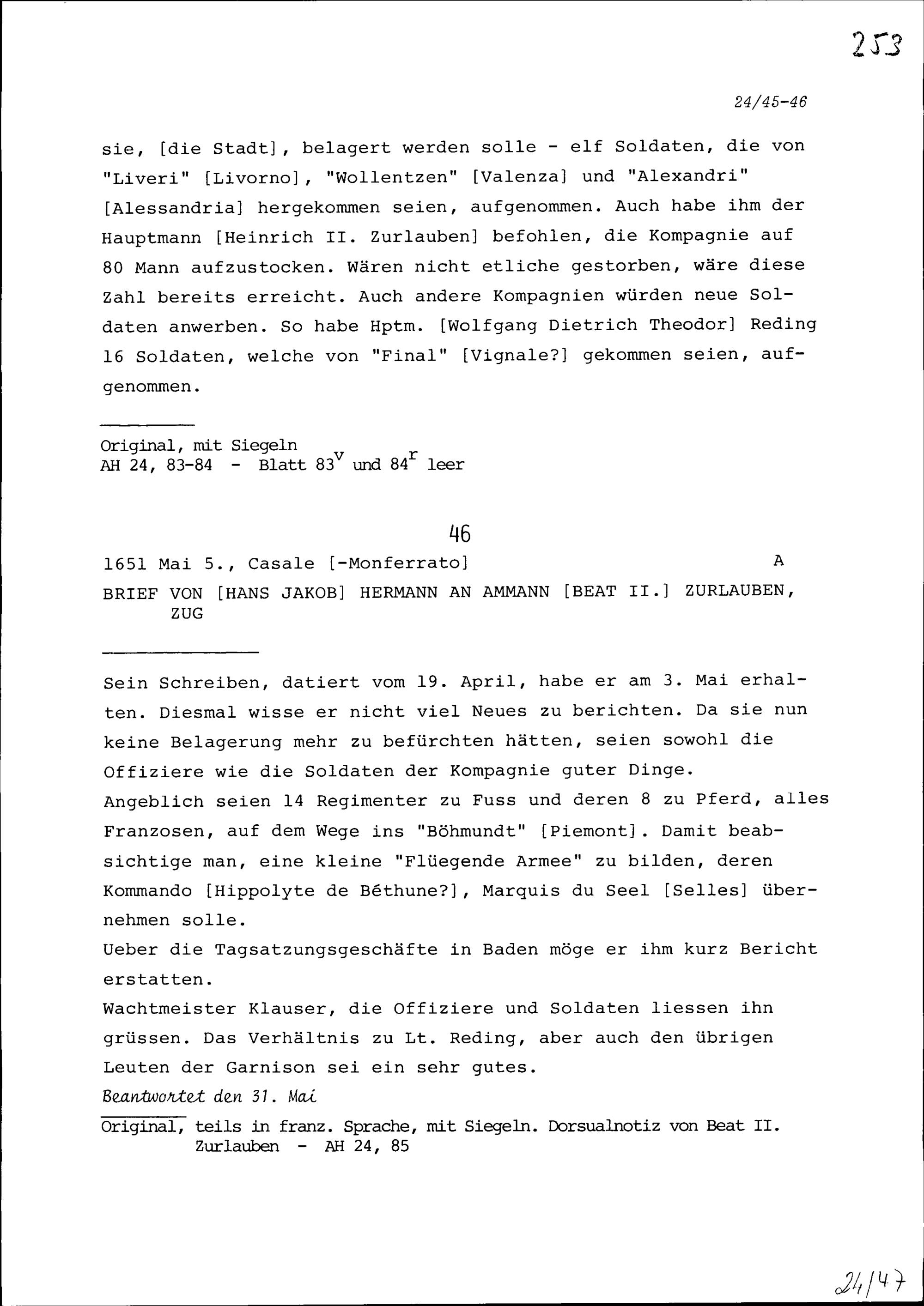 Schreiben von Hans Jakob Hermann an Beat II. Zurlauben, Ammann, Zug