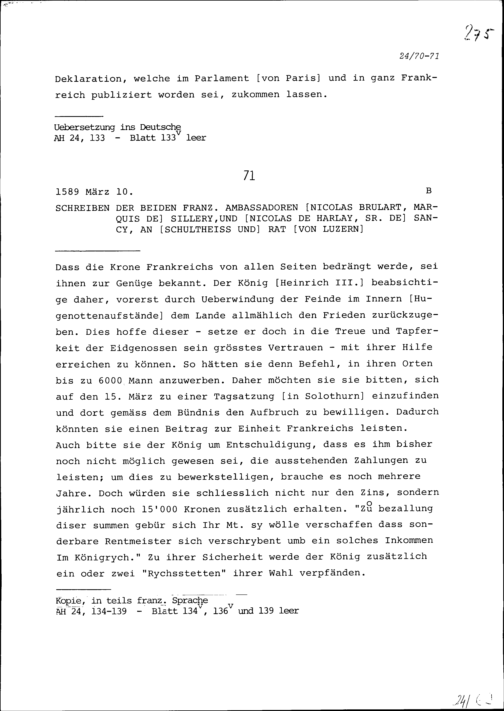 Schreiben von Nicolas Brûlart, Marquis de Sillery, Ambassador von Frankreich, an...