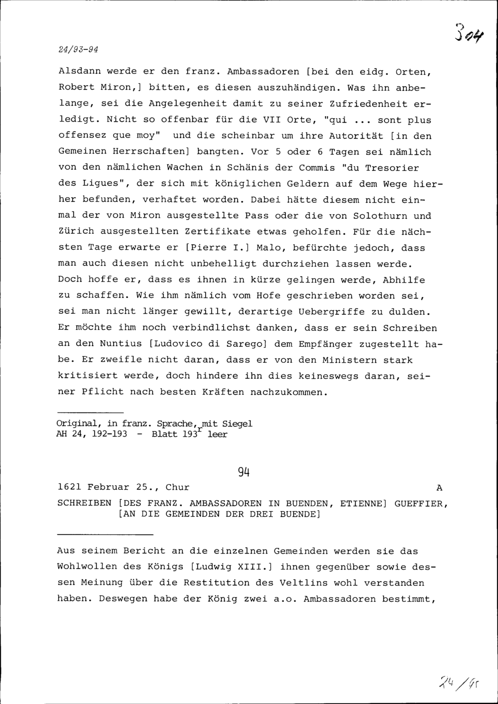 Schreiben von Etienne Gueffier, Ambassador von Frankreich in Bünden, an Konrad III....