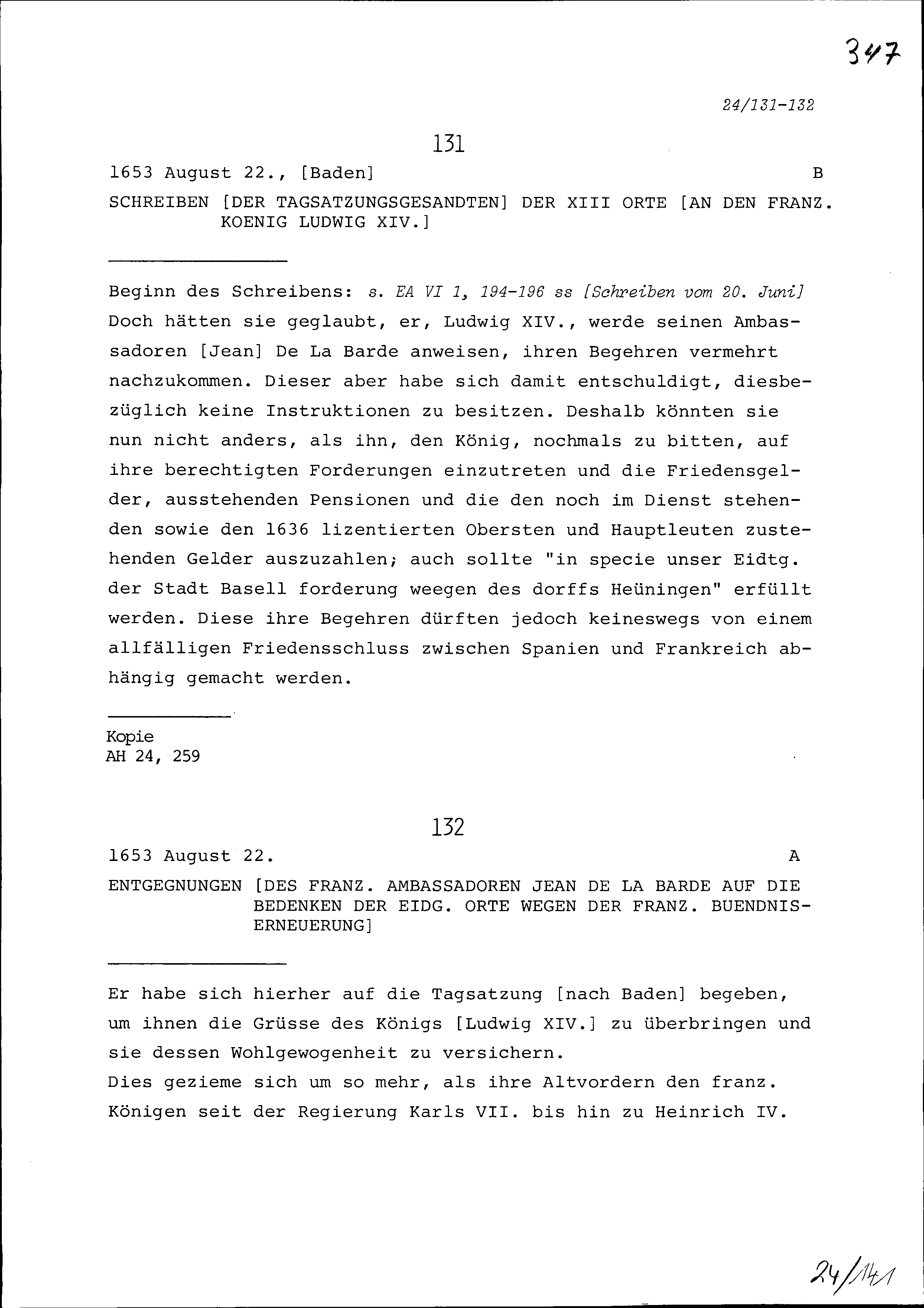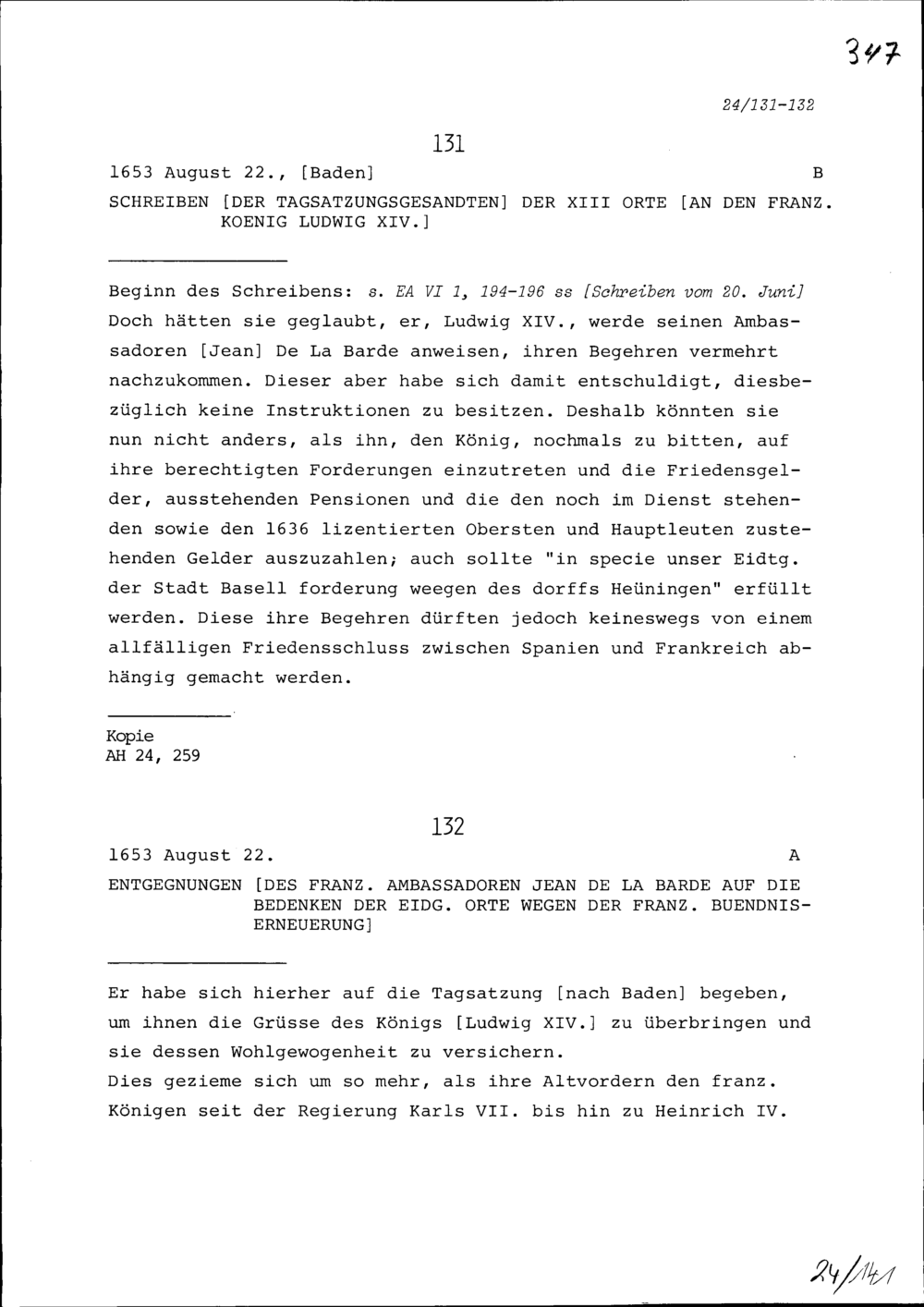 Entgegnungen von Jean de la Barde, Ambassador von Frankreich, auf die Bedenken der Eidgenössischen Orte wegen der französischen Bündniserneuerung