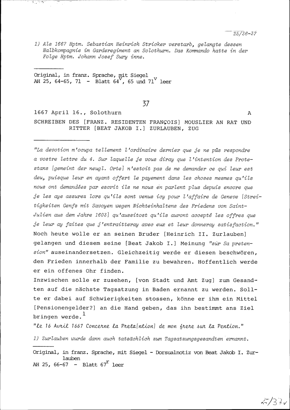 Schreiben von François Mouslier, Resident von Frankreich, an Beat Jakob I. Zurlauben, Rat, Zug