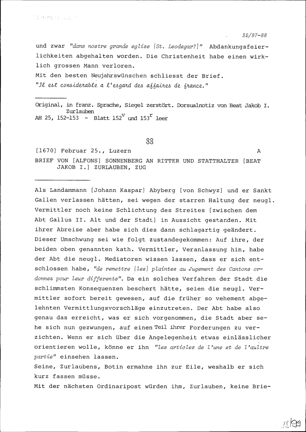 Schreiben von Alfons von Sonnenberg an Jakob I. Zurlauben, Zug, und an Beat Jakob I. Zurlauben, Statthalter