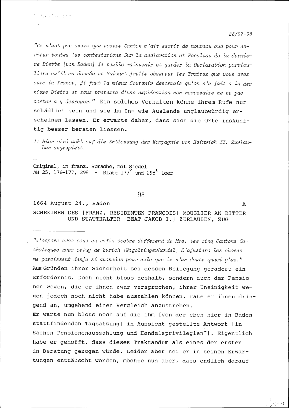 Schreiben von François Mouslier, Resident von Frankreich, an Beat Jakob I. Zurlauben, Statthalter, Zug