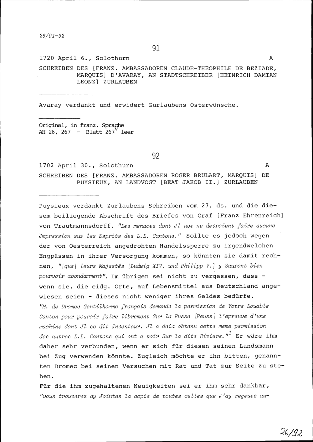 Schreiben von Roger Brûlart, Marquis de Puysieux, Ambassador von Frankreich, an Beat Jakob II. Zurlauben, Landvogt