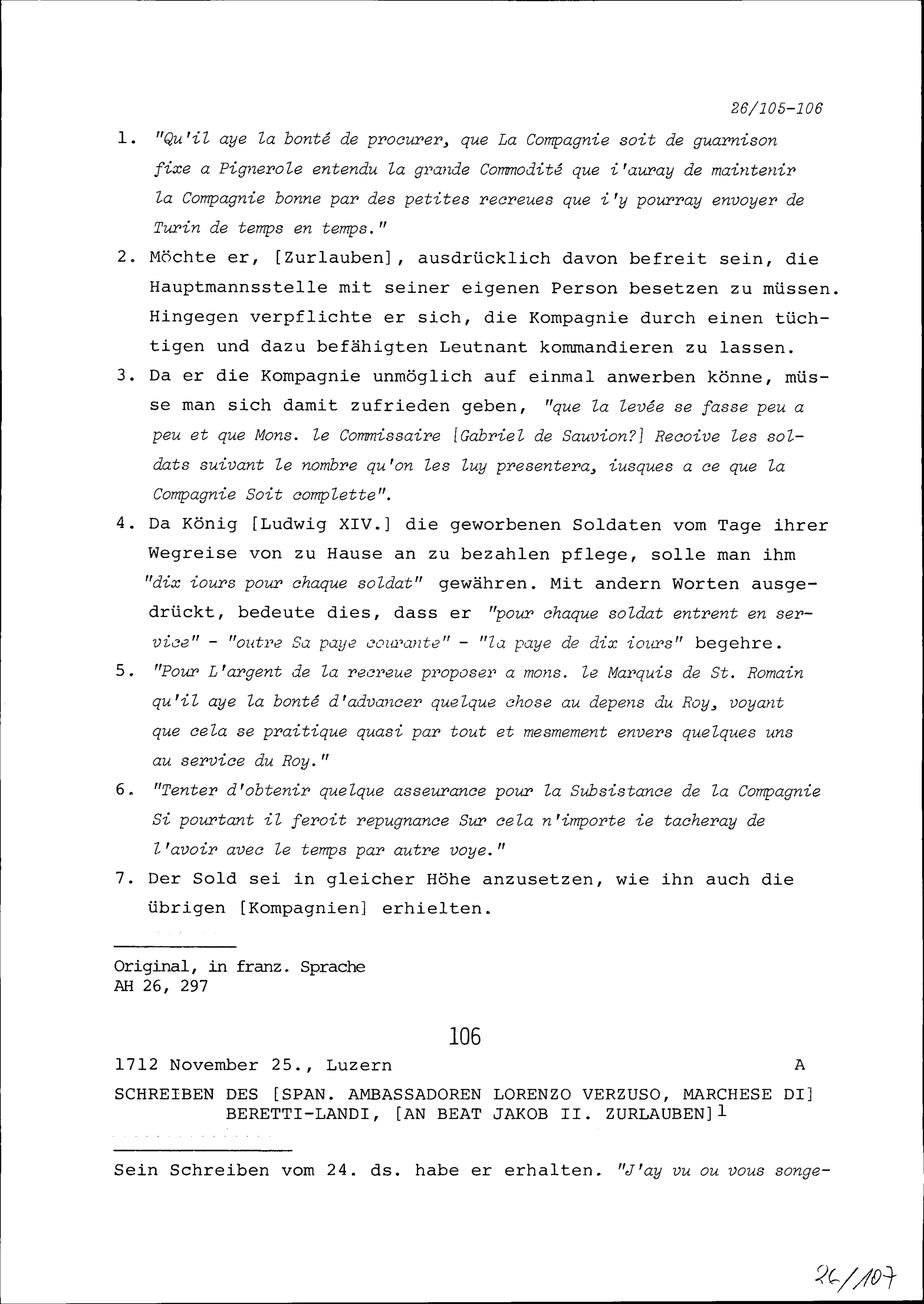 Forderungen von Beat Kaspar Zurlauben, die Beat Jakob I. Zurlauben gegenüber Melchior de Harod de Senevas, Marquis de Saint-Romain, Ambassador von Frankreich, vertreten solle