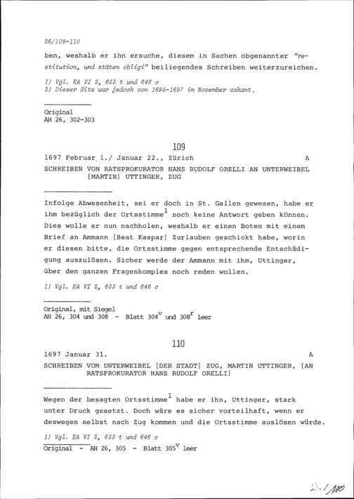 Schreiben von Martin Uttinger, Unterweibel der Stadt Zug, an Hans Rudolf Orelli,...