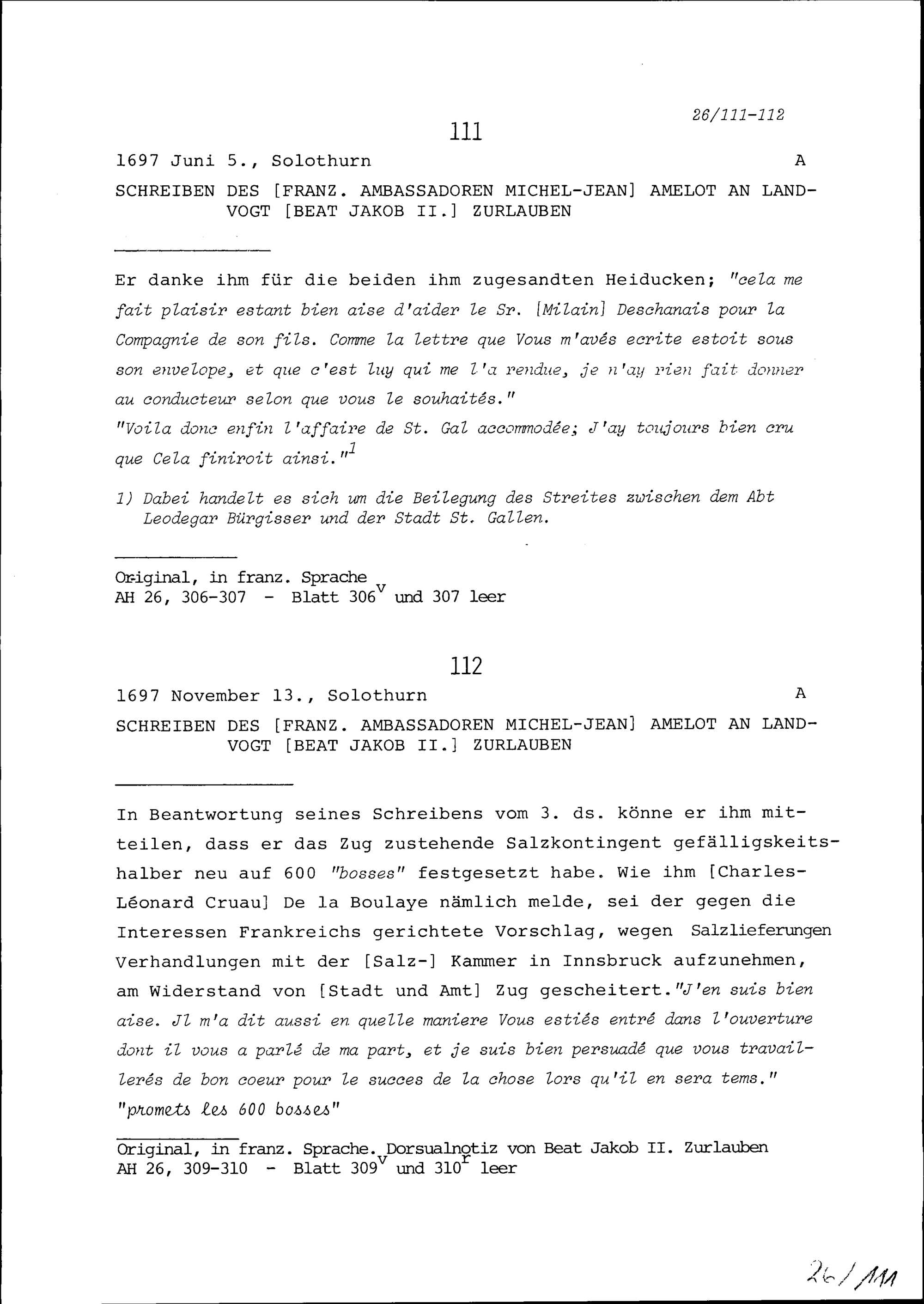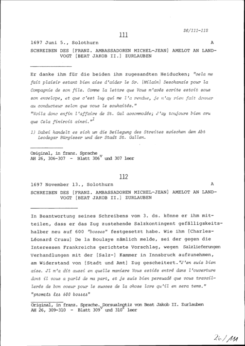 Schreiben von Michel-Jean Amelot, Ambassador von Frankreich, an Beat Jakob II. Zurlauben, Landvogt