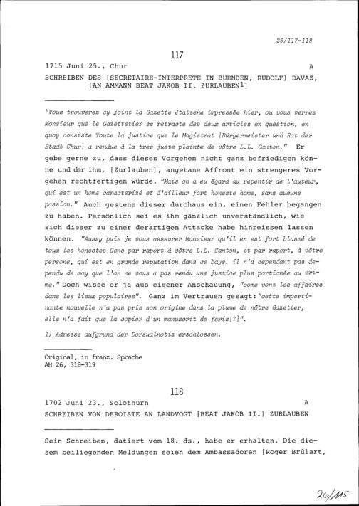 Schreiben von NN Deroiste an Beat Jakob II. Zurlauben, Landvogt