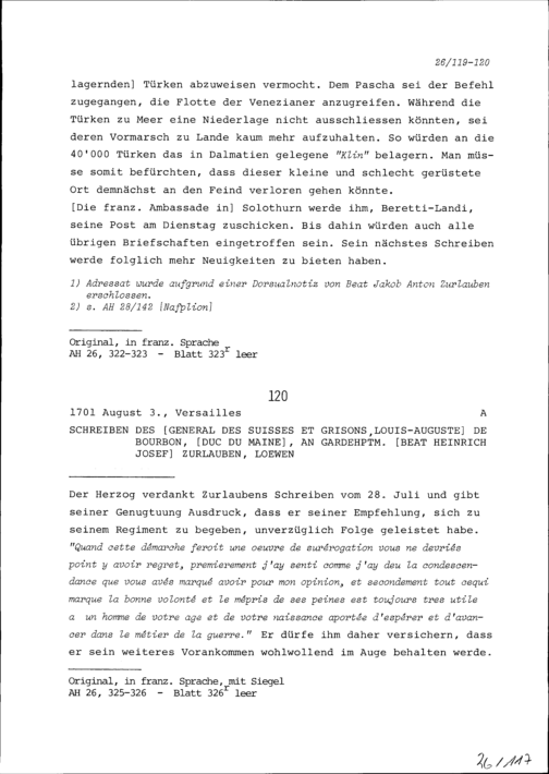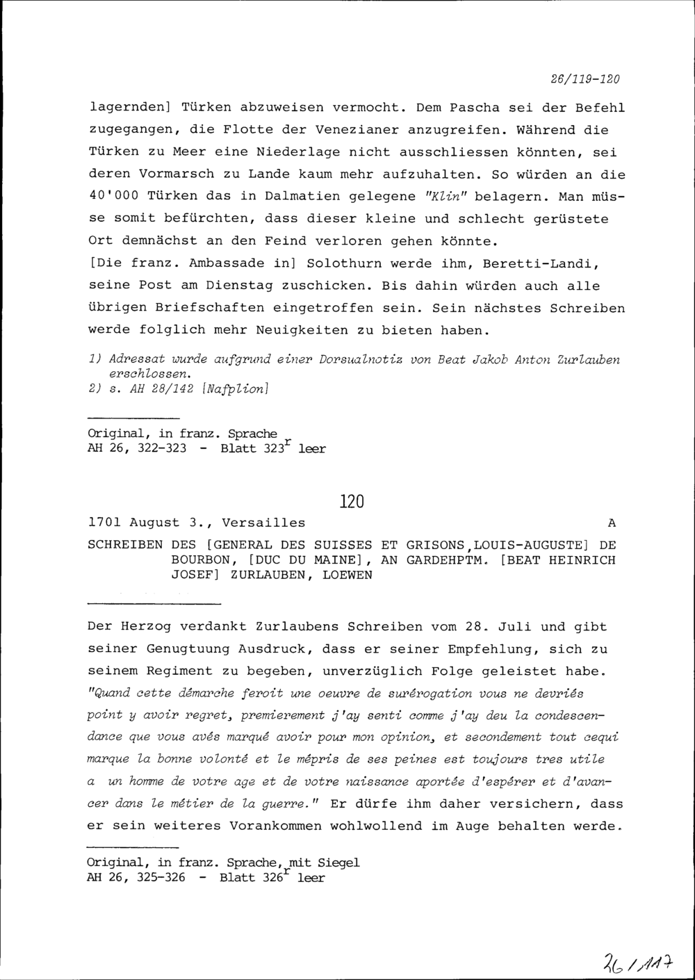 Schreiben von Lorenzo Verzuso, Marchese di Beretti-Landi, Ambassador von Spanien, an Beat Jakob II. Zurlauben, Ammann