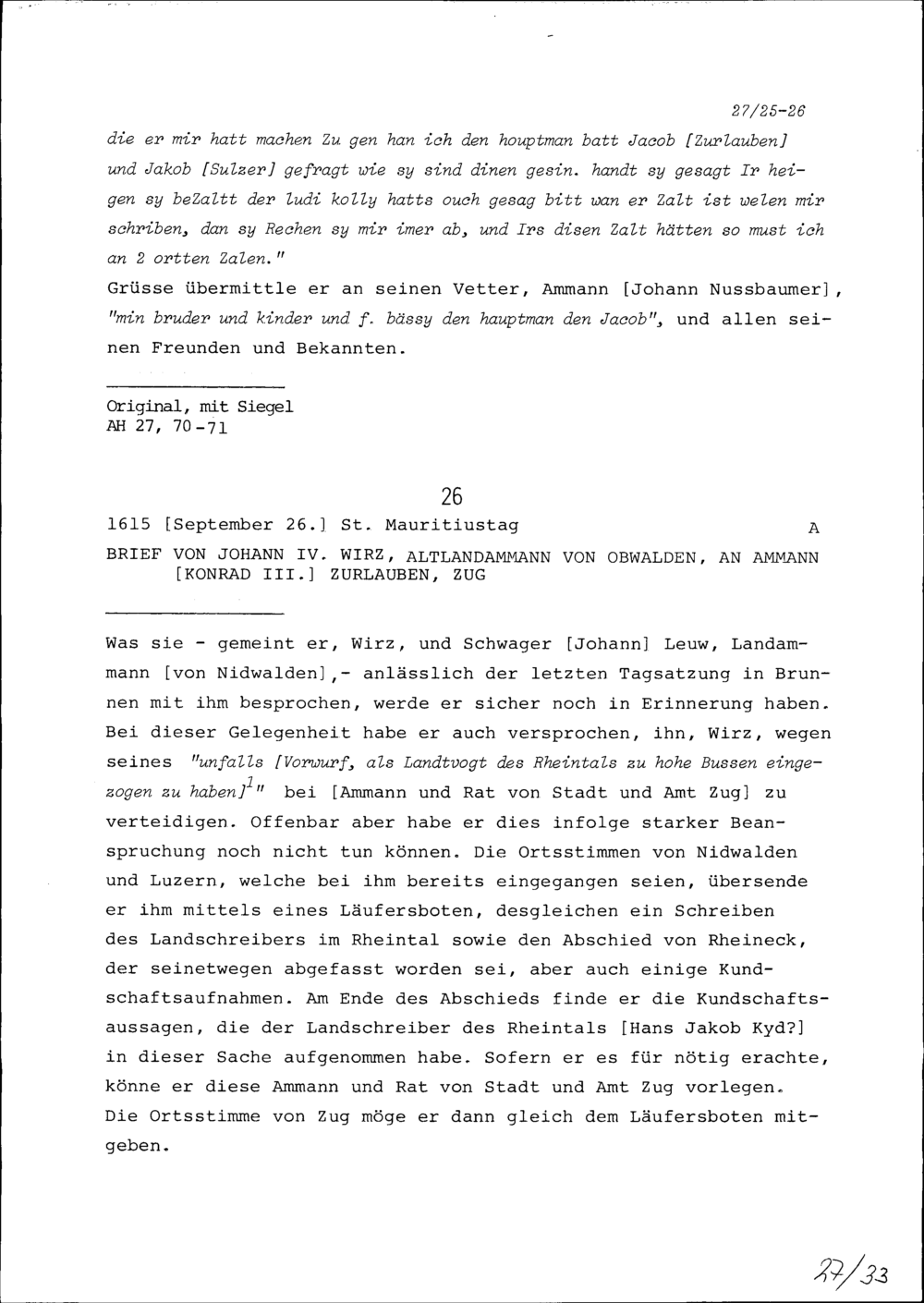 Schreiben von Michael Nussbaumer an Konrad III. Zurlauben, Ammann und Rat, Zug