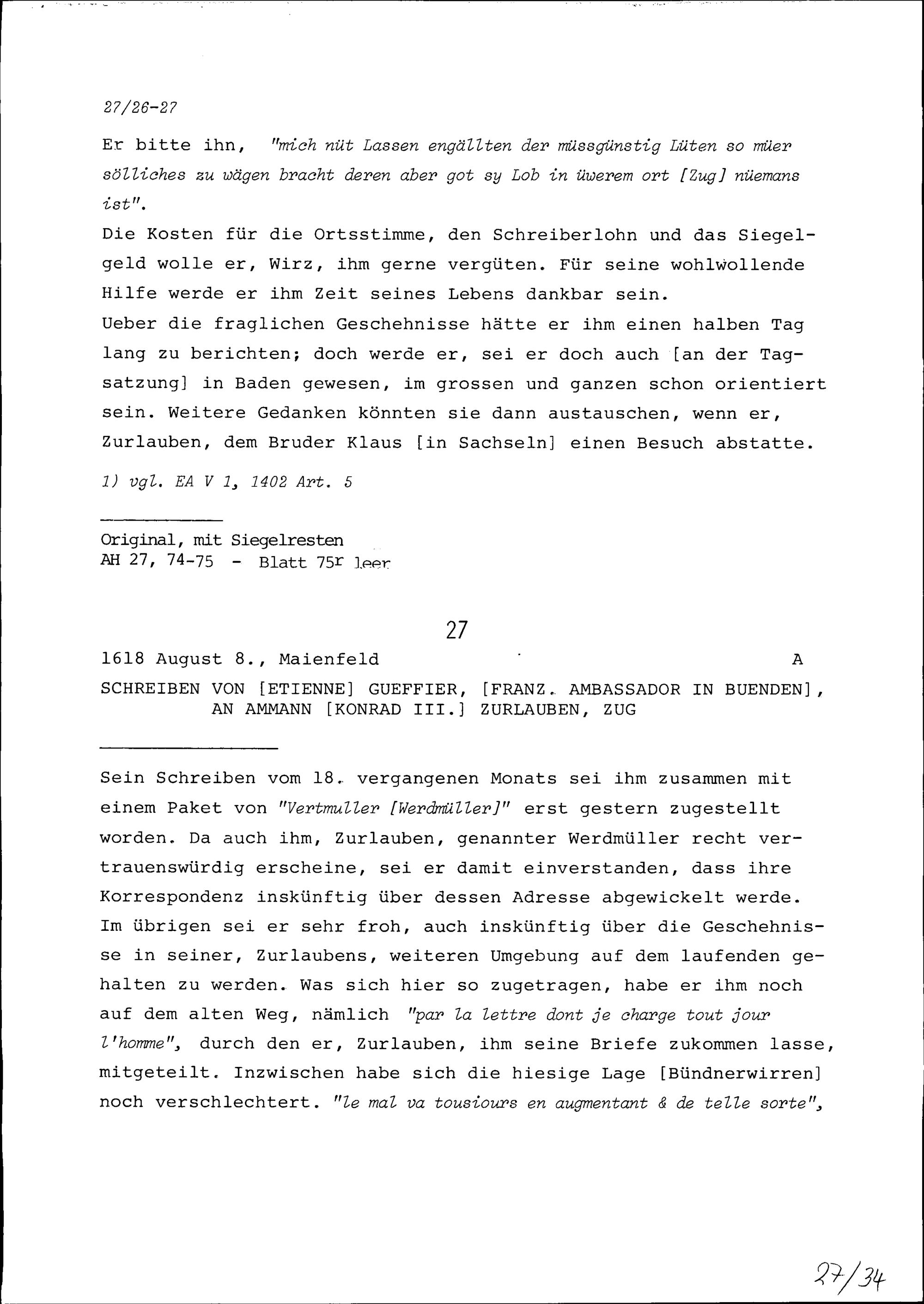 Schreiben von Johann IV. Wirz, Altlandammann von Obwalden, an Konrad III. Zurlauben, Ammann, Zug