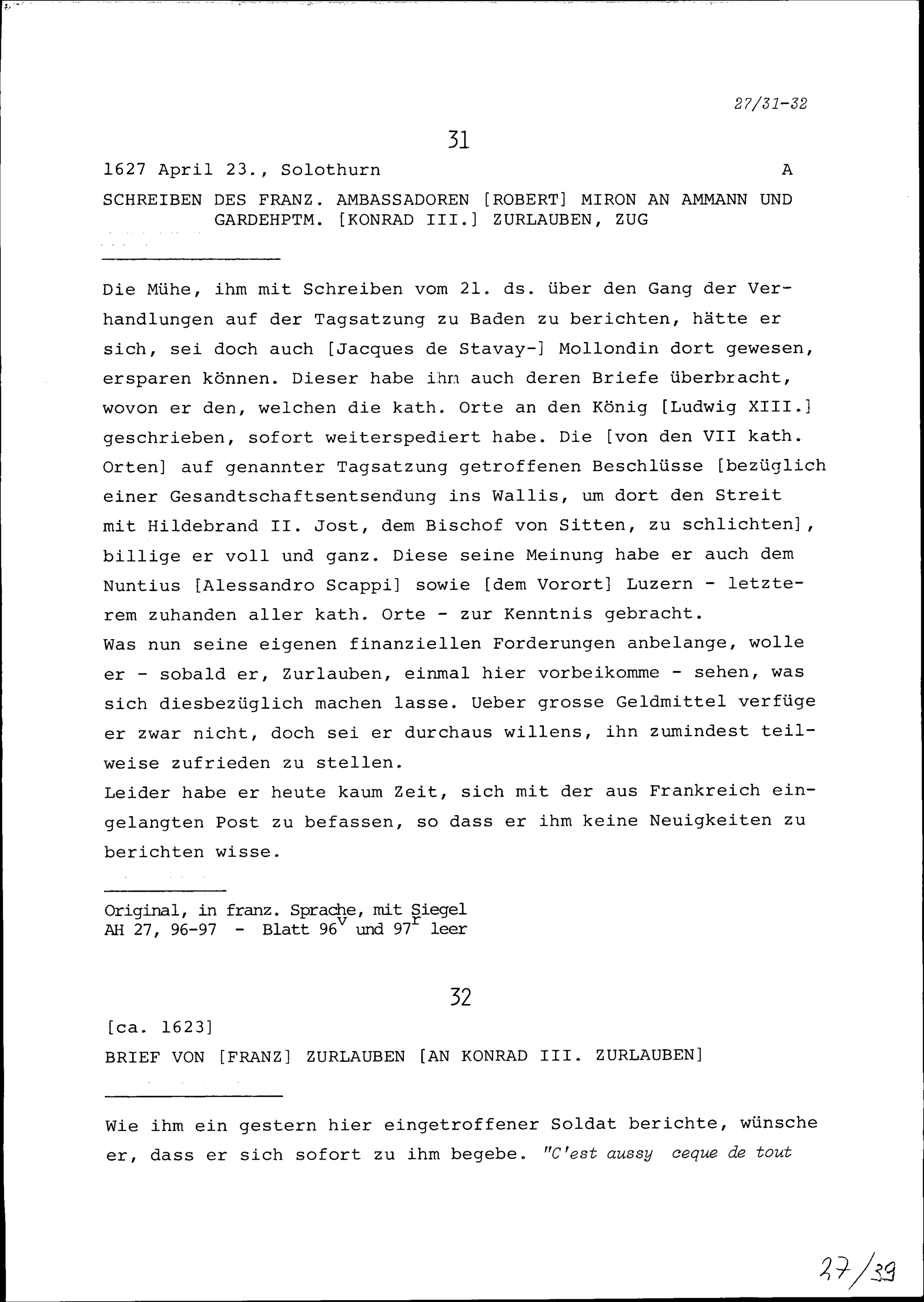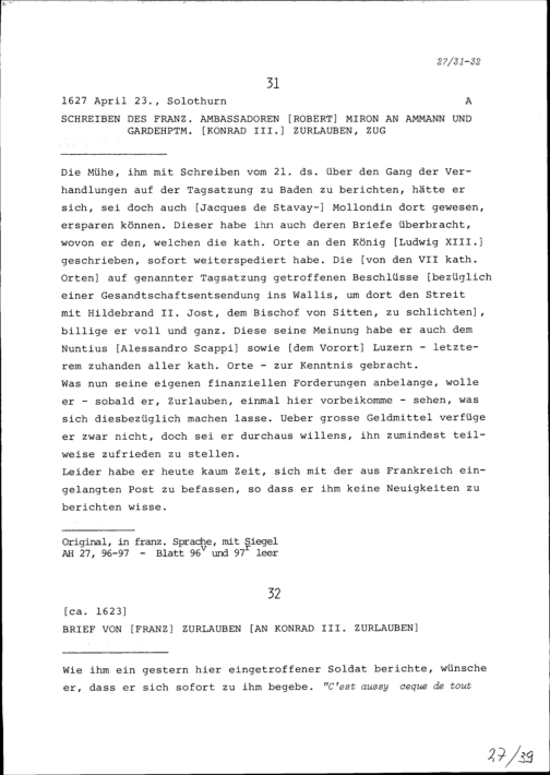 Schreiben von Franz Zurlauben an Konrad III. Zurlauben