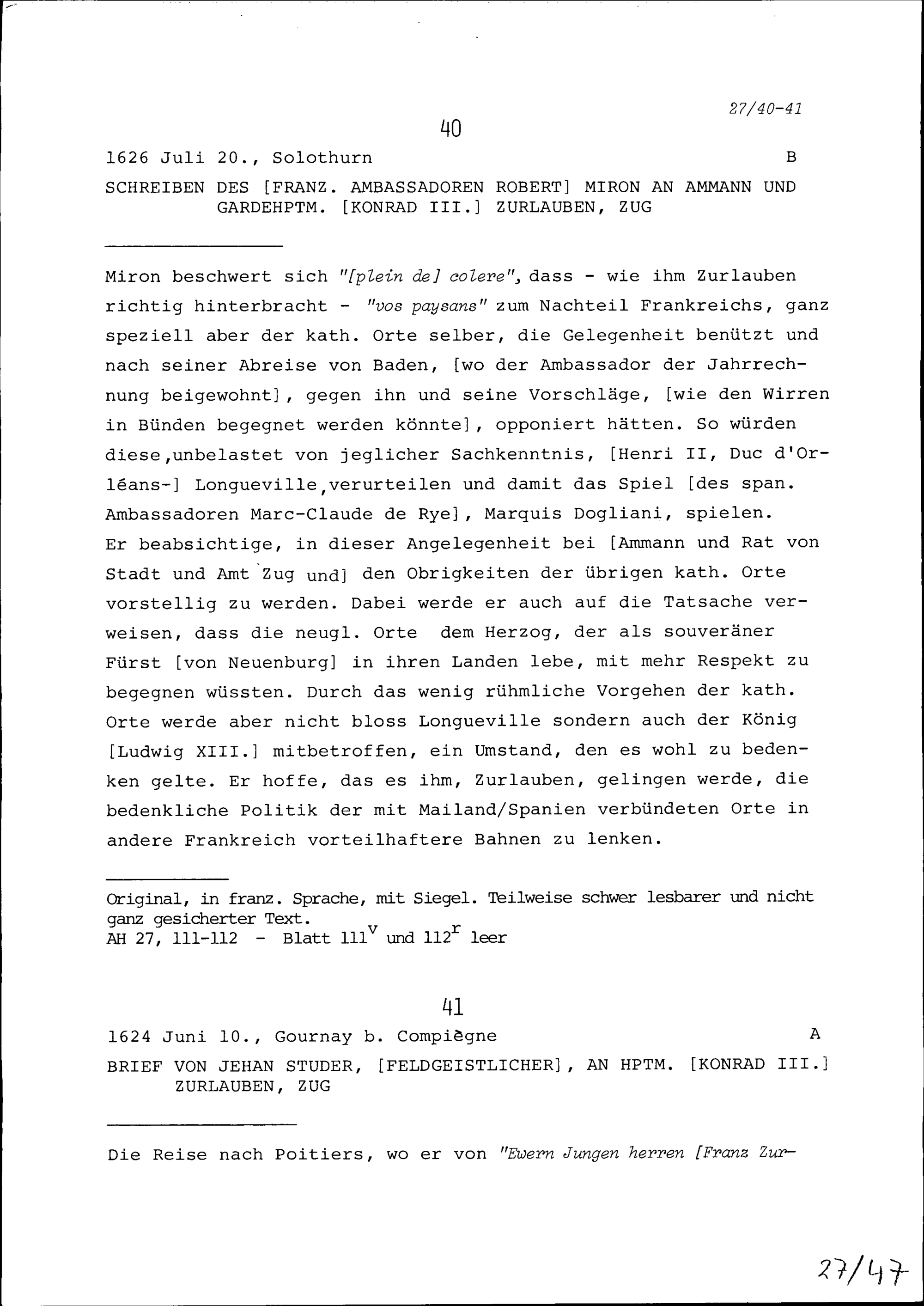Schreiben von Johann Studer, Feldgeistlicher, an Konrad III. Zurlauben, Hauptmann, Zug