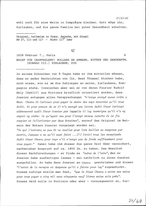 Schreiben von Johann Studer, Feldgeistlicher, an Konrad III. Zurlauben, Hauptmann, Zug
