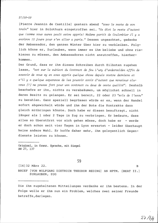 Schreiben von NN Bonnaire an Konrad III. Zurlauben, Statthalter, Zug