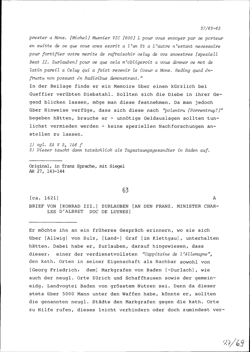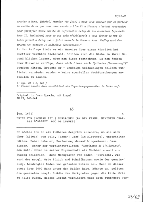 Schreiben von Robert Miron, Ambassador von Frankreich, an Konrad III. Zurlauben,...