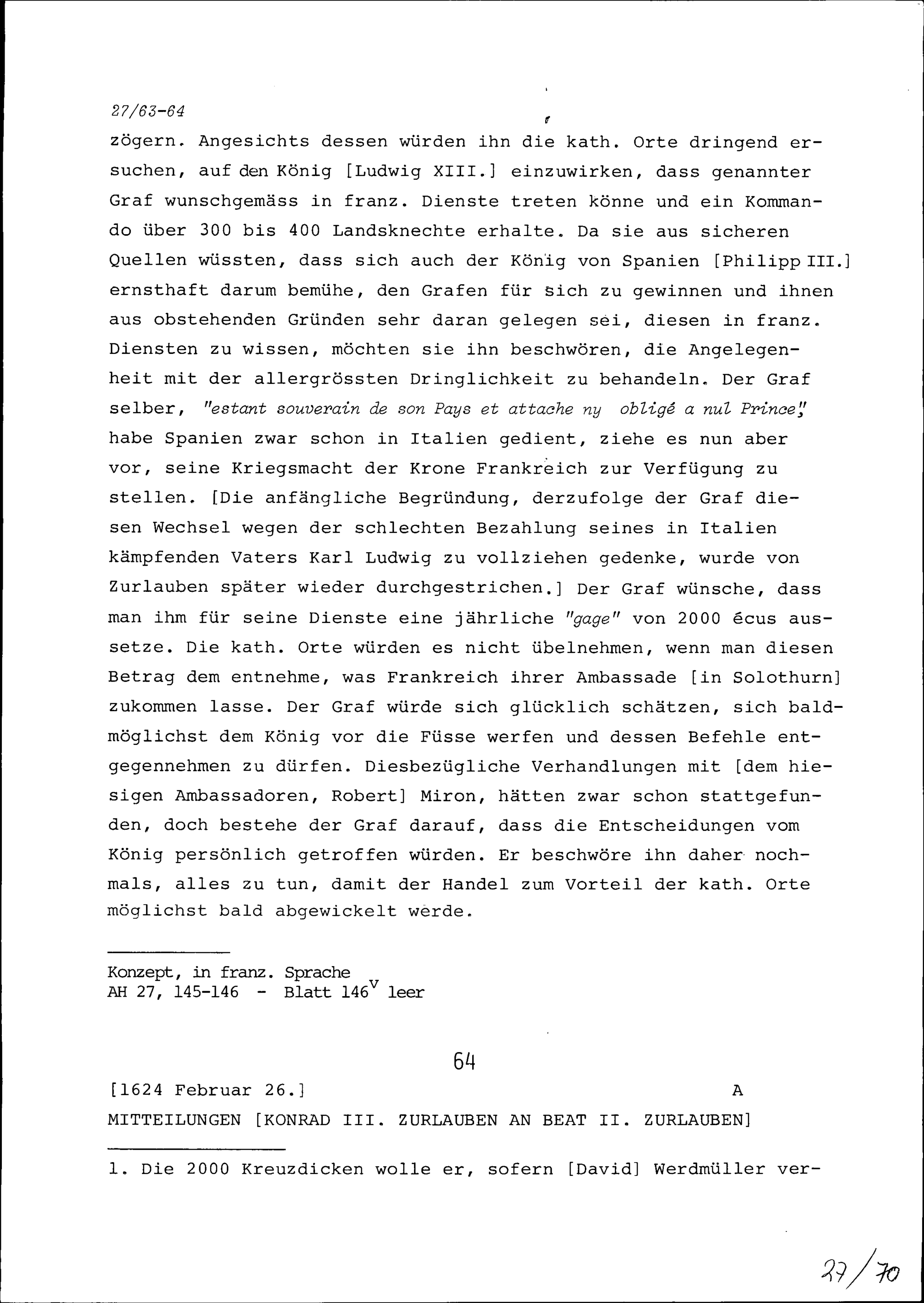 Schreiben von Konrad III. Zurlauben an Charles d'Albert, Duc de Luynes, französischer Minister