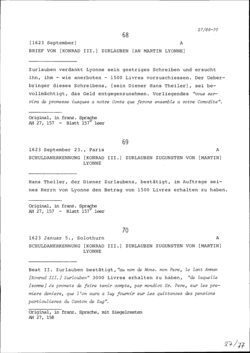 Schuldanerkennung von Konrad III. Zurlauben zugunsten von Martin Lyonne