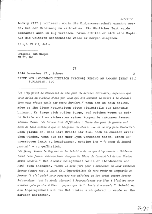 Schreiben von Alfons von Sonnenberg an Beat II. Zurlauben, Ammann und Hauptmann,...