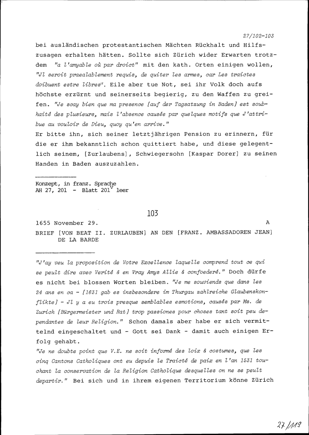 Schreiben von Beat II. Zurlauben an Jean de la Barde, Ambassador von Frankreich