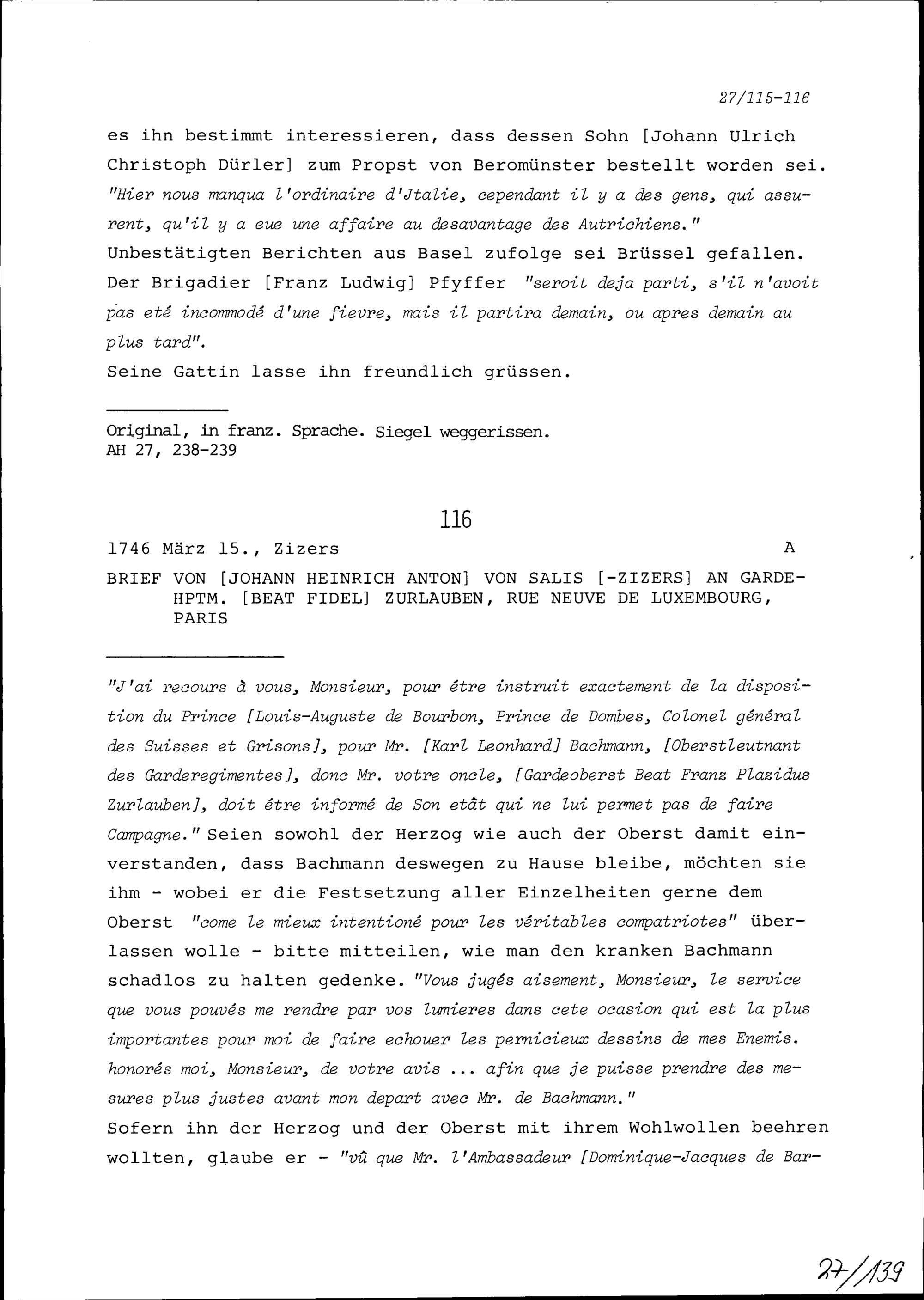 Schreiben von Karl Johann Rudolf Mohr, Grossrat, an Beat Fidel Zurlauben, Gardehauptmann, Paris