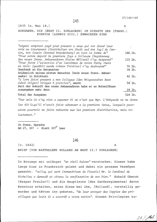 Schreiben von Barthélémy Rolland an Beat II. Zurlauben